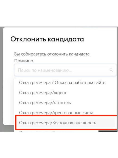 «Восточную внешность» в качестве причины отказа кандидат:ке можно выбрать и в корпоративной CRM системе отдела кадров.