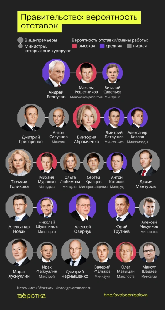 «Вёрстка» не пишет о перспективах силовых министров, глав МИДа и Минюста, так как их полномочия, как и карьерная судьба, полностью «замкнуты» на президенте. Текст посвящен связям и перспективам гражданских вице-премьеров и министров.