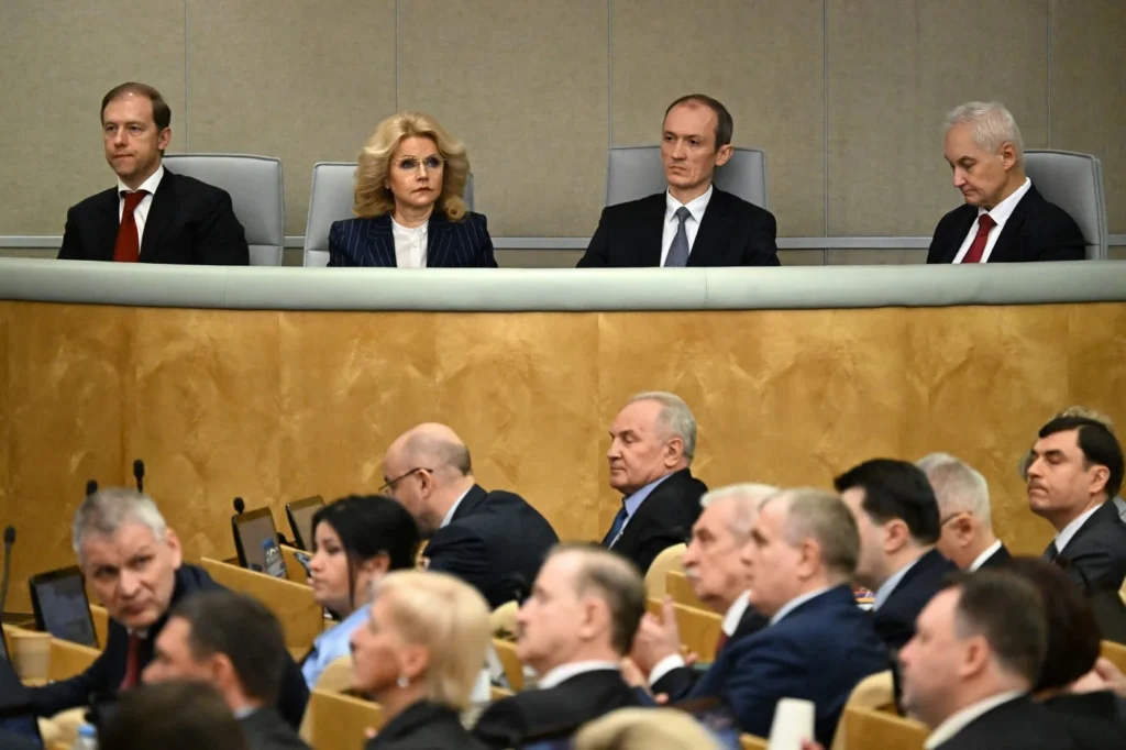Руководитель Аппарата Правительства РФ Дмитрий Григоренко (второй справа в верхнем ряду) во время пленарного заседания Государственной Думы России в Москве, 3 апреля 2024. Фото: Profimedia.
