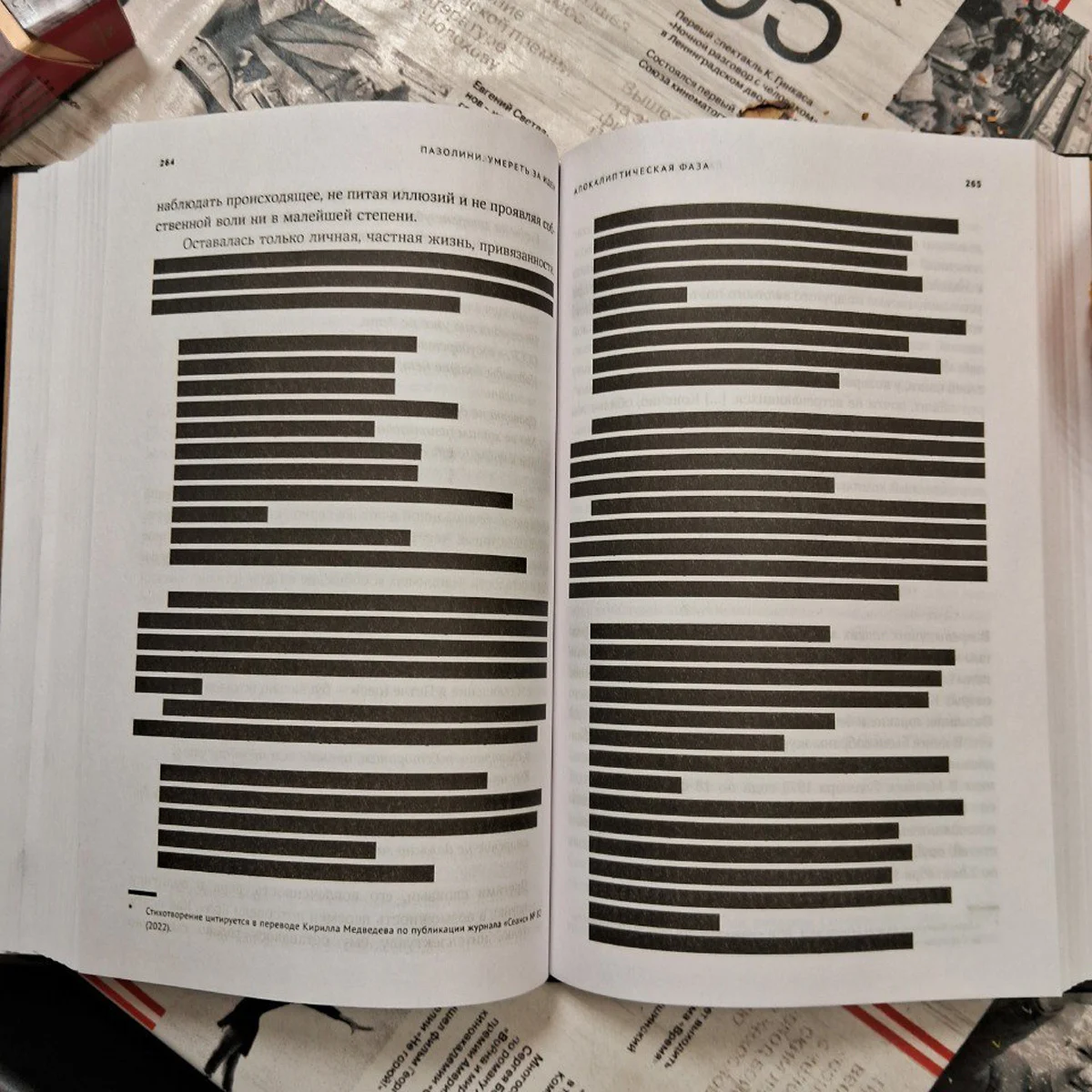 Решение о признании воображаемого «ЛГБТ-движения» экстремистским создало возможность обвинить любого издателя и любого автора, в чьих книгах содержатся хотя бы намеки на «нетрадиционные отношения», в терроризме. Теперь издательства отправляют «подозрительные книги» из своего портфеля на экспертизу, а другие просто снимают с продажи (включая книги всемирно известных писателей — Майкл Каннингем, Ханья Янагихара, Владимир Сорокин). Ну а звездой последних дней стала биография Пазолини, великого режиссера и открытого гомосексуала, в которой издательство АСТ закрасило часть текста черным. С вопросами, почему за книгами пришли именно сейчас, что всё это значит и чего ждать от книжной цензуры дальше, «Новая-Европа» обратилась к литературному критику Анне Наринской.