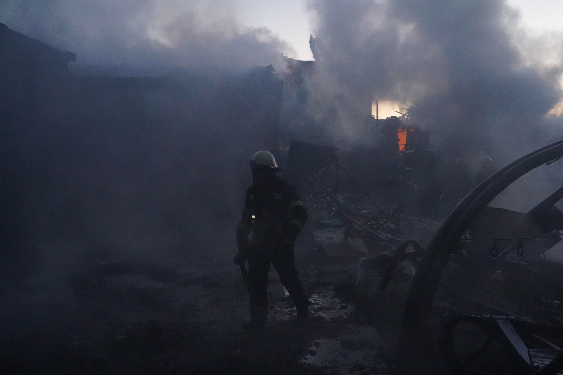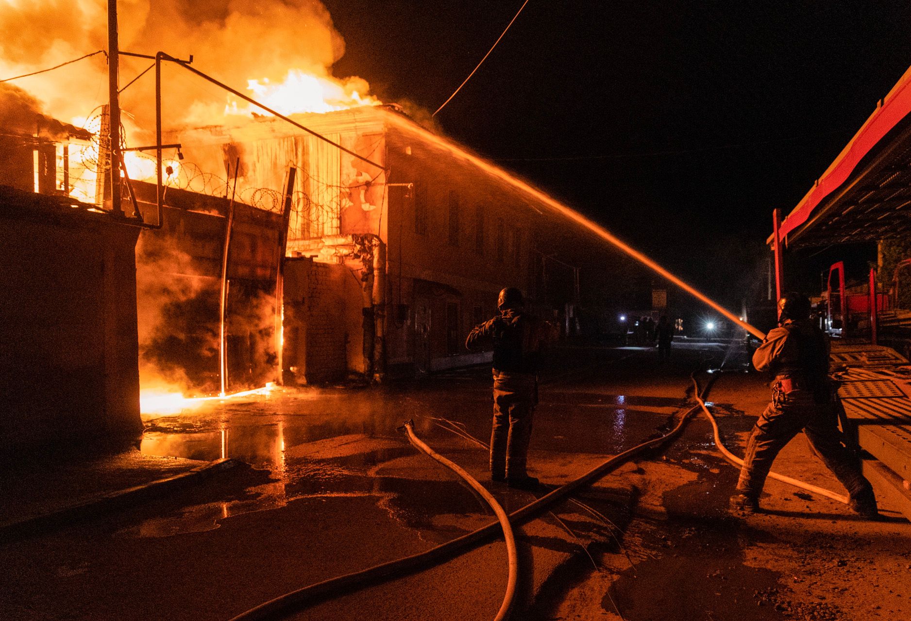 Pavlo Pakhomenko / NurPhoto / Getty Images Пожарные борются с возгоранием на пострадавшем от российского удара предприятии. По данным харьковских властей, пожар вызвало падение на объект обломков сбитого дрона-камикадзе «Герань-2» — так в ВС РФ называют беспилотники иранского производства Shahed 136. О том, почему именно БПЛА из Исламской республики стали важным фактором войны в Украине и других вооруженных конфликтов последних лет по всему миру, читайте в нашем материалеSergey Bobok / AFP / Scanpix / LETA Как сообщали 4 мая харьковские паблики, площадь возгорания на предприятии составила не менее трех тысяч квадратных метровYakiv Liashenko / EPA / Scanpix / LETA Всего, по данным украинских властей, Харьков в ночь на 4 мая атаковали не менее 13 «Гераней» — и несмотря на то, что все они были сбиты силами противовоздушной обороны (ПВО) города, падение обломков вызвало пожары и привело к жертвам и пострадавшим среди гражданского населения сразу в нескольких местахAndrii Marienko / AP / Scanpix / LETA Харьков подвергается массированным обстрелам со стороны Вооруженных сил РФ (ВС РФ) все последние месяцы. Уже в ночь на 5 мая российские беспилотники вновь атаковали городAndrii Marienko / AP / Scanpix / LETA На фото — пожарные тушат возгорание в жилом частном доме, уничтоженном после падения обломков беспилотника в ночь на 4 мая