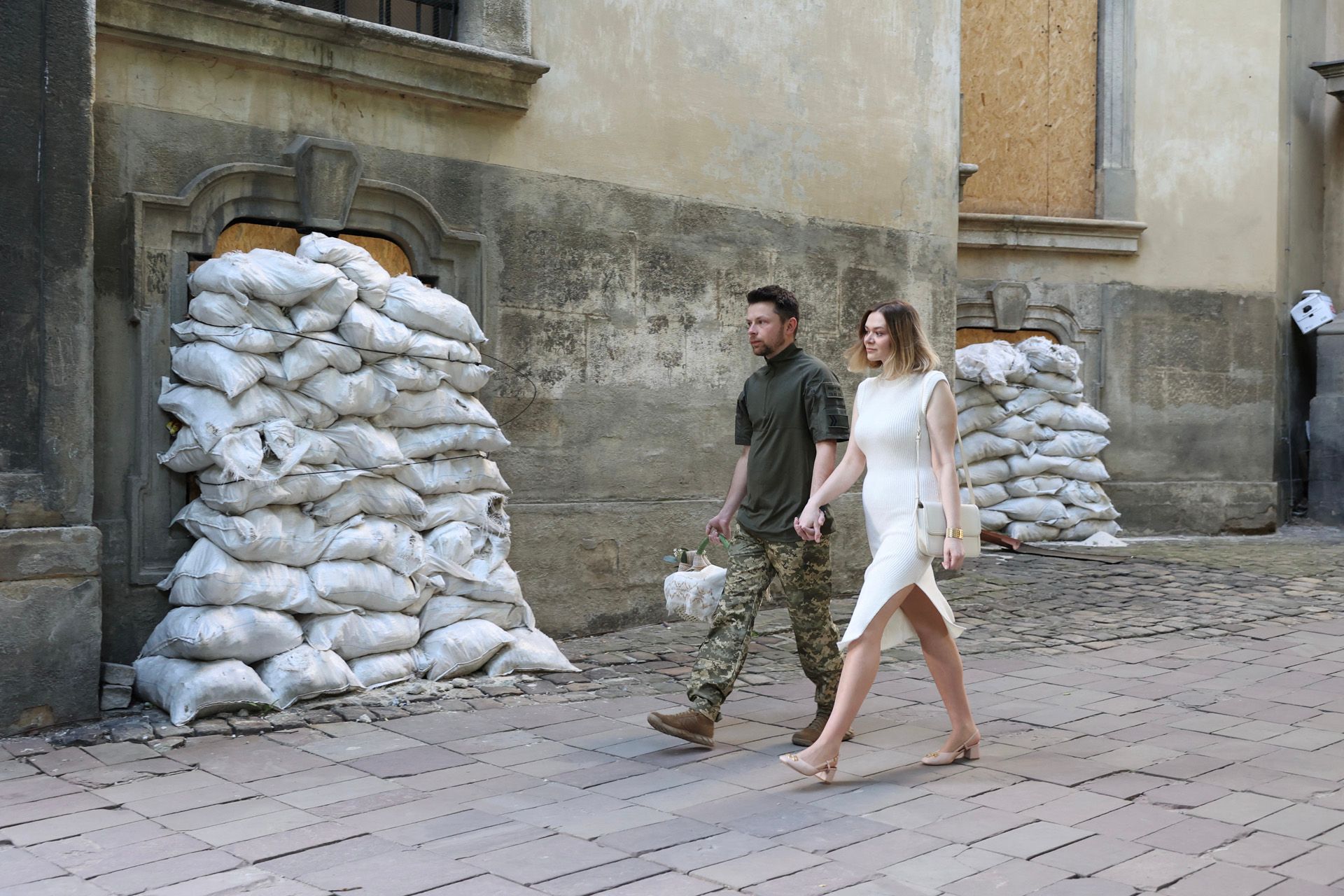 Roman Baluk / Reuters / Scanpix / LETA Прихожане одной из церквей в центре Львова покидают храм после пасхальной службы. Здание церкви укреплено на случай обстрелов города российской армией. Один из прихожан— военнослужащий Вооруженных сил Украины (ВСУ)