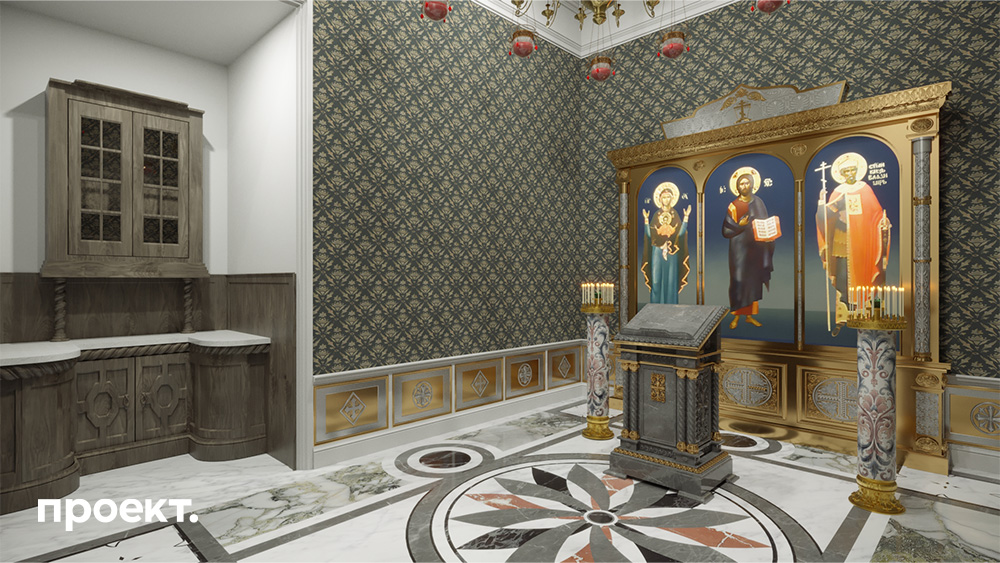 Детали. После ремонта дворца, завершившегося в начале 2023 году, под церковь отдали помещение, в котором, согласно предыдущему плану, были машинки и паровозик. Стены этого помещения теперь украшены крестами, а в алтаре установили совершенно нетипичный набор икон, сказали два искусствоведа и один иконописец.