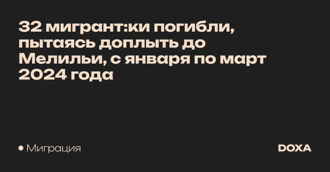 По меньшей мере 32 человека погибли за первые три месяца 2024 года, пытаясь доплыть до испанского города Мелилья, который находится на средиземноморском побережье Африки. Как сообщают защитни:цы мигранто:к из неправительственной организации Solidary Wheels, большинство мигранто:к пытались добраться в Мелилью из Марокко. В докладе отмечается, что большинство погибших — дети.