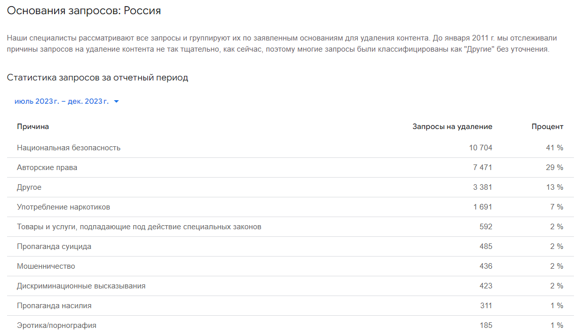 Среди причин запросов лидирует национальная безопасность (10 704 запроса), далее идут авторские права (7 471) и употребление наркотиков (1 691).