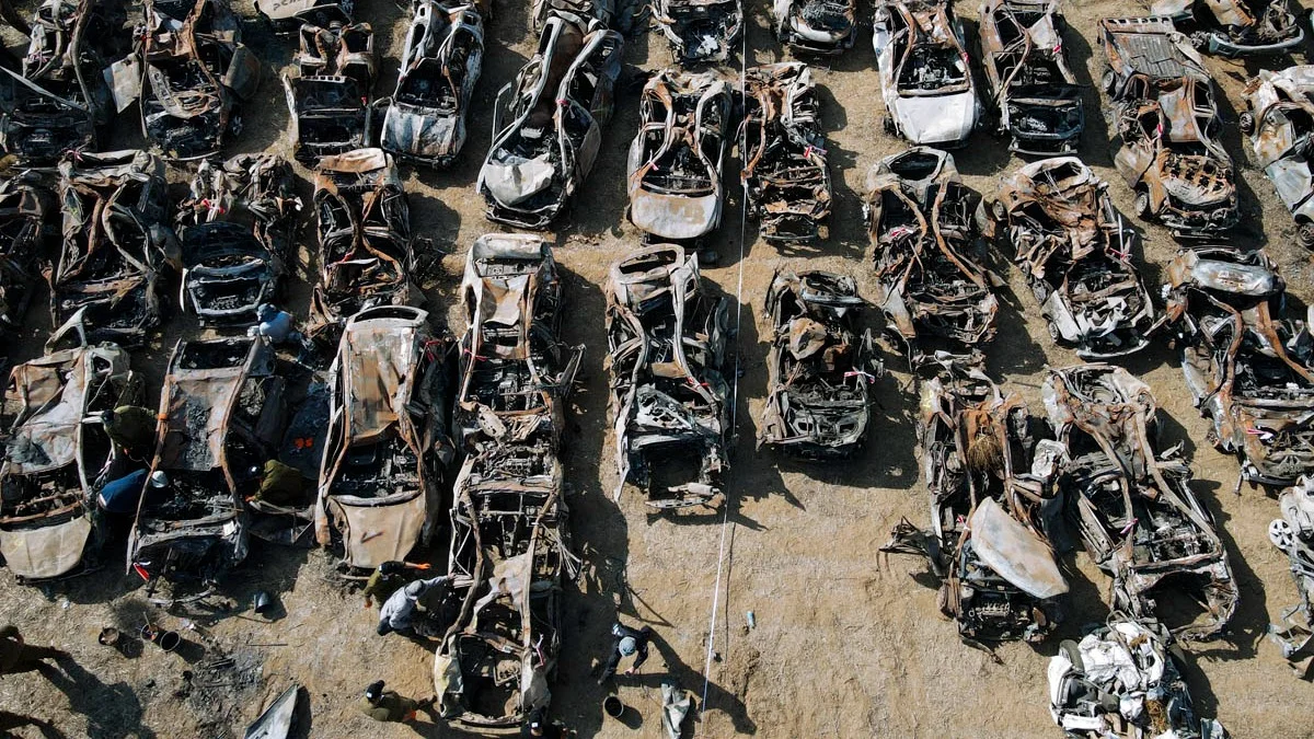 Автомобили, сожженные в результате нападения палестинского движения ХАМАС 7 октября 2023 года. Фото: AP / TASS