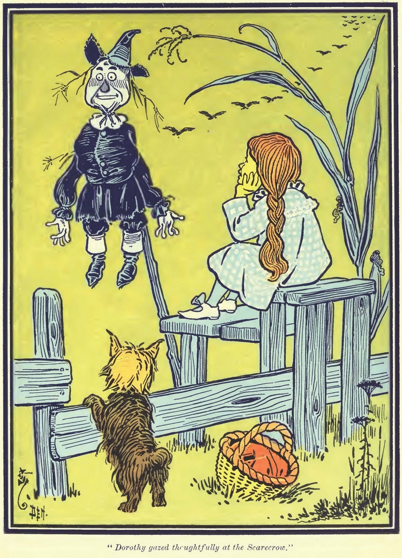 После множества испытаний Страшила получает мозги из отрубей. У Баума это решение построено на созвучии bran (отруби), brand (бренд, знак качества) и brain (мозг(и)). В эпоху всемирных выставок и в область сельского хозяйства, а не только промышленности, приходит реклама. Любая американская газета 1900 года производит упорядоченное хозяйство колонок и советов фермерам, создает сенсации в виде передовиц и печатает рекламу. Так что Баум просто развернул свой детский опыт газетного издателя, создавая собственную версию пугала. Фермер — это и человек, читающий газету, но и человек, способный отпугнуть врагов, распугать ворон — в книге Баума он смог переловить всех ворон. Иначе говоря, новый фермер ведет себя наступательно, а не оборонительно, пугало превращается в почти промышленный механизм, со своим «брендом». Но что следует дальше?