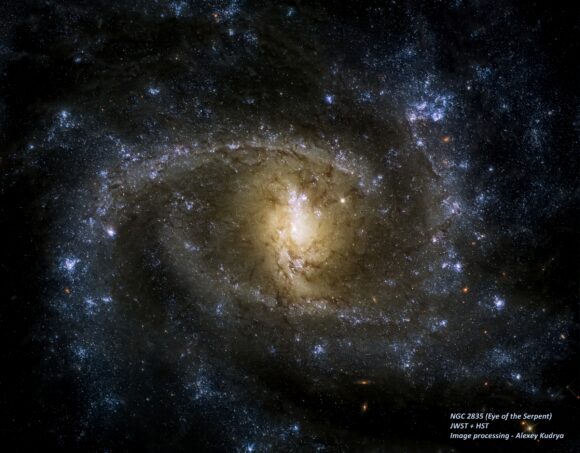 Как и наш Млечный Путь, NGC 2835 обладает перемычкой (баром) — пересекающей ее посередине структурой, состоящей из звезд и газа. На изображении отчетливо выделяется яркое галактическое ядро, чем-то напоминающее глаз. Отсюда и второе название этой галактики — Глаз Змеи. Галактика была обнаружена немецким астрономом Вильгельмом Темпелем 13 апреля 1884 года.
