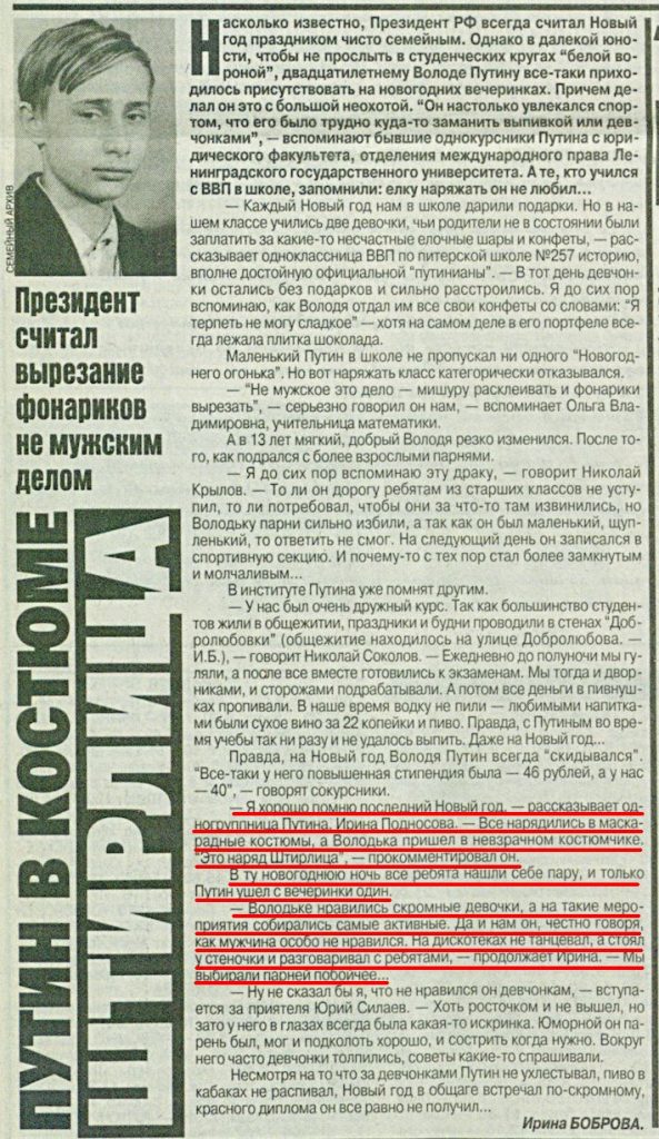 В самом начале президентства Путина Ирина Подносова часто делилась воспоминаниями из студенческой жизни. „«Я хорошо помню последний Новый год, — рассказывала она „Московскому комсомольцу“ в декабре 2001 года. — Все нарядились в маскарадные костюмы, а Володька пришел в невзрачном костюмчике. „Это наряд Штирлица“, — прокомментировал он. В ту новогоднюю ночь все ребята нашли себе пару, и только Путин ушел с вечеринки один. — Володьке нравились скромные девочки, а на такие мероприятия собирались самые активные. Да и нам он, честно говоря, как мужчина особо не нравился. На дискотеках не танцевал, а стоял у стеночки и разговаривал с ребятами. Мы выбирали парней побойчее…»