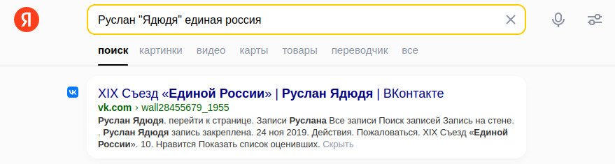 На странице Ядюди во «Вконтакте» написано, что он закончил Московский государственный юридический университет (МГЮА). Страница уже скрыта, но в кэше «Яндекса» осталось упоминание о том, что еще в 2019 году Ядюдя писал у себя на странице о XIX Съезде «Единой России».