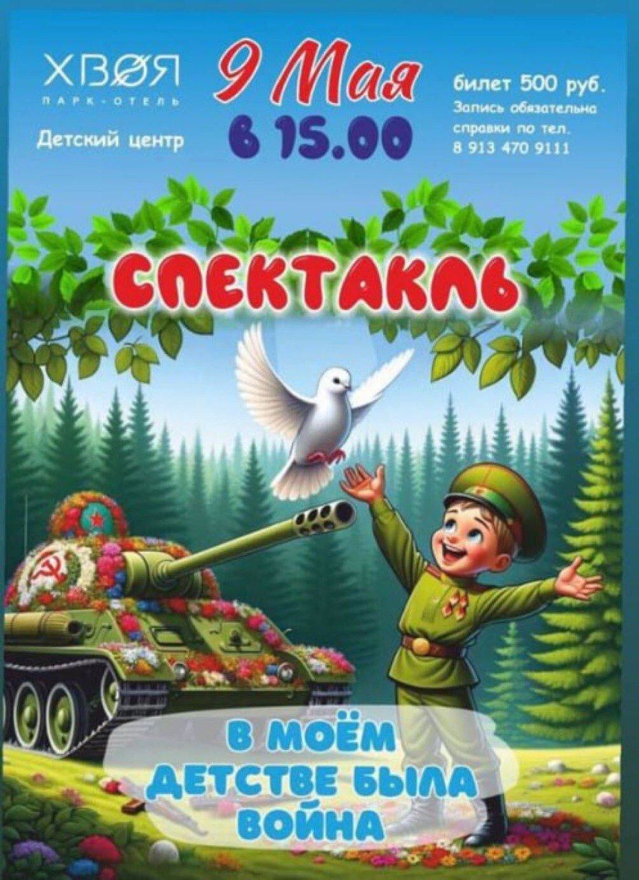 В начале мая на сайте новосибирского парк-отеля "Хвоя" появился анонс военного спектакля для детей. На афише – танк и радостный мальчик в военной форме. И надпись – "в моем детстве была война"