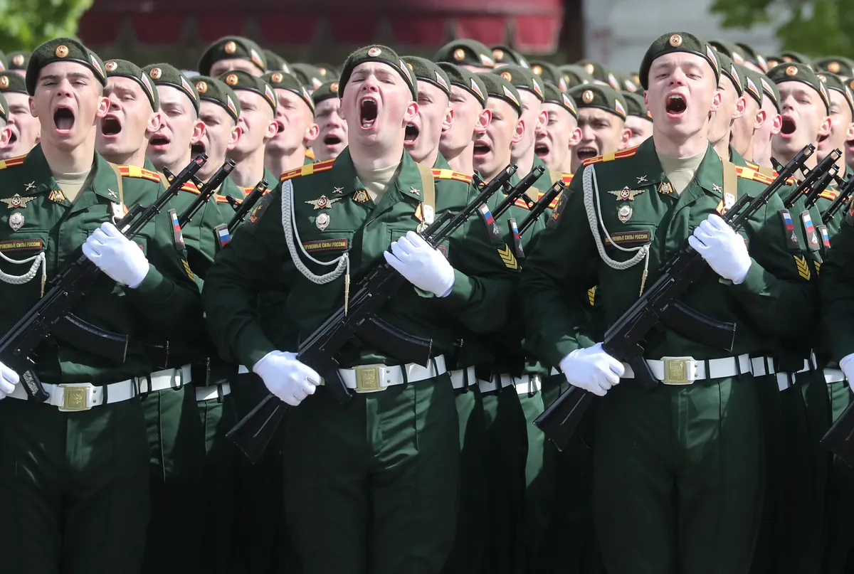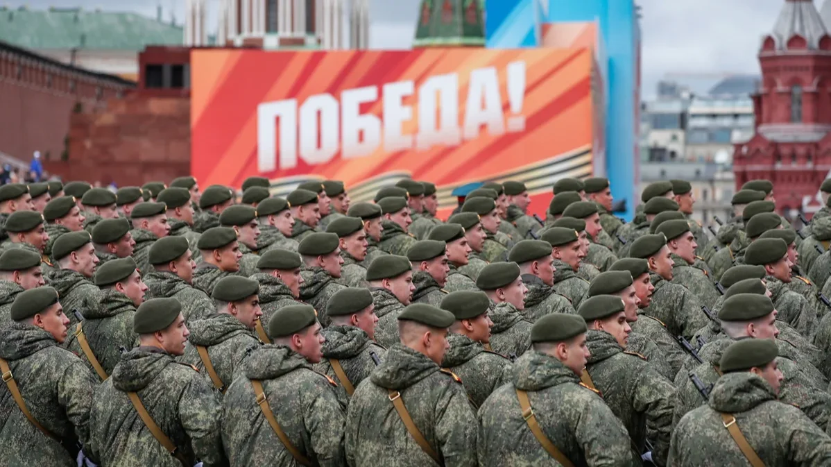 Russian soldiers stand before a poster reading “Victory!” during a rehearsal for Moscow’s Victory Day parade on Red Square, 5 May 2024. Photo: Yuri Kochetkov /EPA-EFE