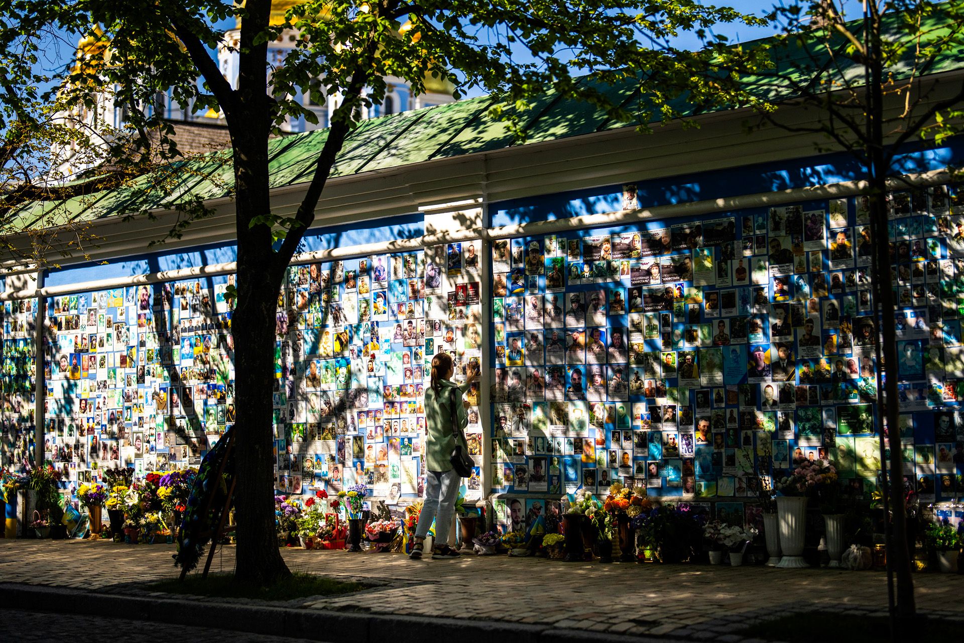 Стена памяти павших защитников Украины появилась в Киеве в 2014 году в виде большого баннера с несколькими десятками фотографий. Через год мемориал перенесли к Михайловскому Златоверхому монастырю, а в 2020 году его реконструировали. Сейчас на стене несколько тысяч фотографий погибших бойцов.