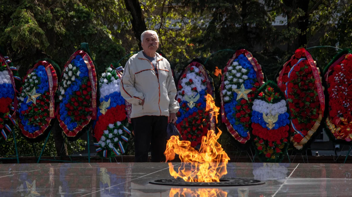 Местный житель на фоне вечного огня в Белгороде, 9 мая 2024 года. Фото: Александр Каратаев / «Новая газета Европа»