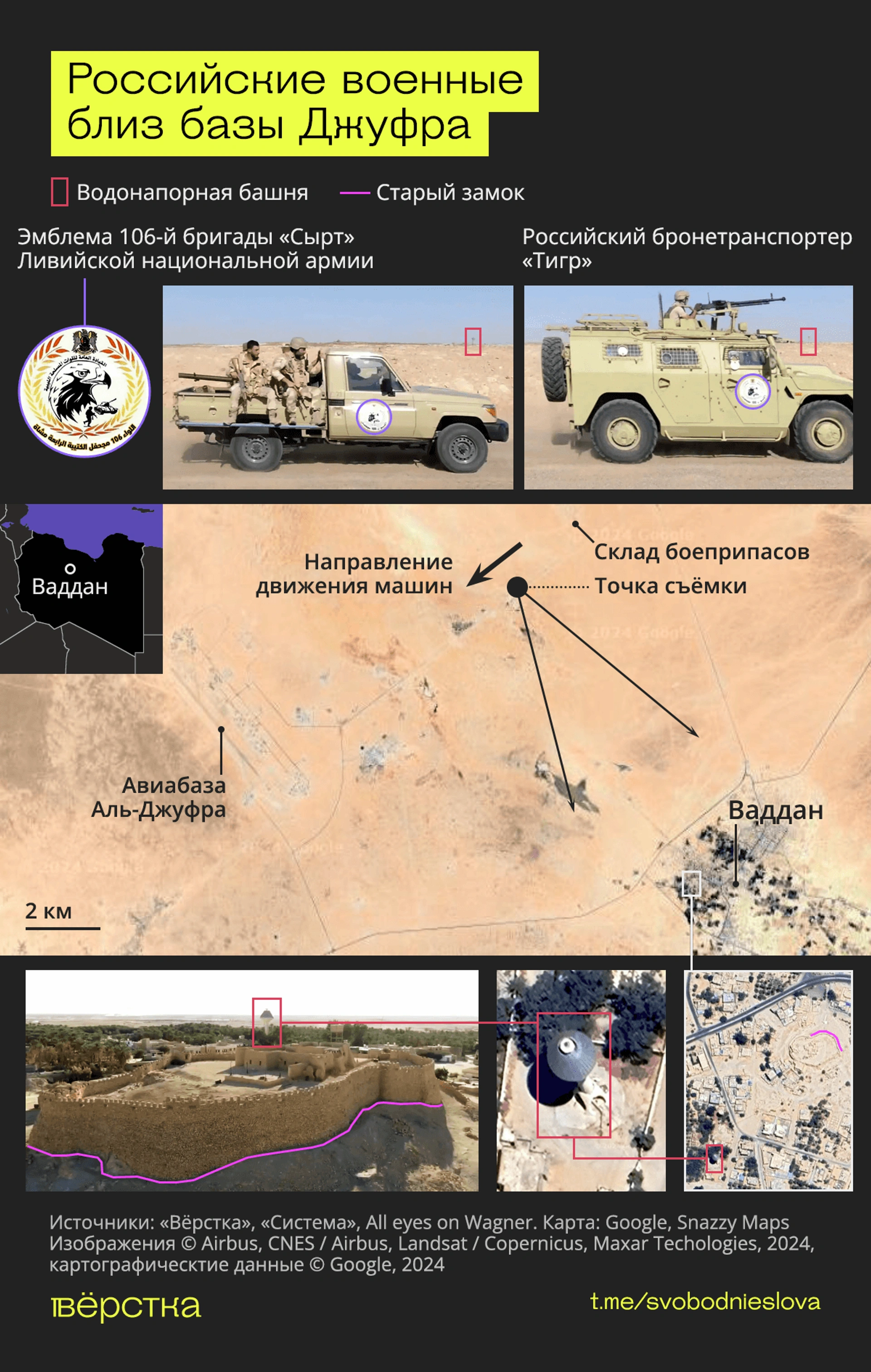 С начала марта российских военных и российскую технику удалось обнаружить как минимум в десяти точках на востоке Ливии. Как выяснили «Вёрстка» и All Eyes on Wagner, российские войска базируются как вокруг крупных военных баз — Джуфра, Гардабии, так и рядом с более мелкими — Ваддан и Эль-Мардж.