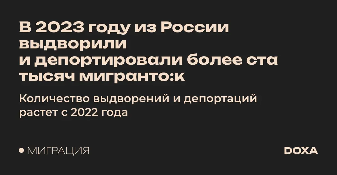 В 2023 вновь выросло число выдворений и депортаций мигранто:к из России, следует из опубликованных Советом глав государств СНГ, данных о миграционной ситуации. В 2023 году выдворили или депортировали всего 108 471 человека, в то время как в 2022 году таких решений было принято 65 774. В 2023 году при выявлении нарушения миграционного законодательства суды принимали решение о выдворении примерно в каждом шестом случае, а в 2022 — примерно в каждом девятом.