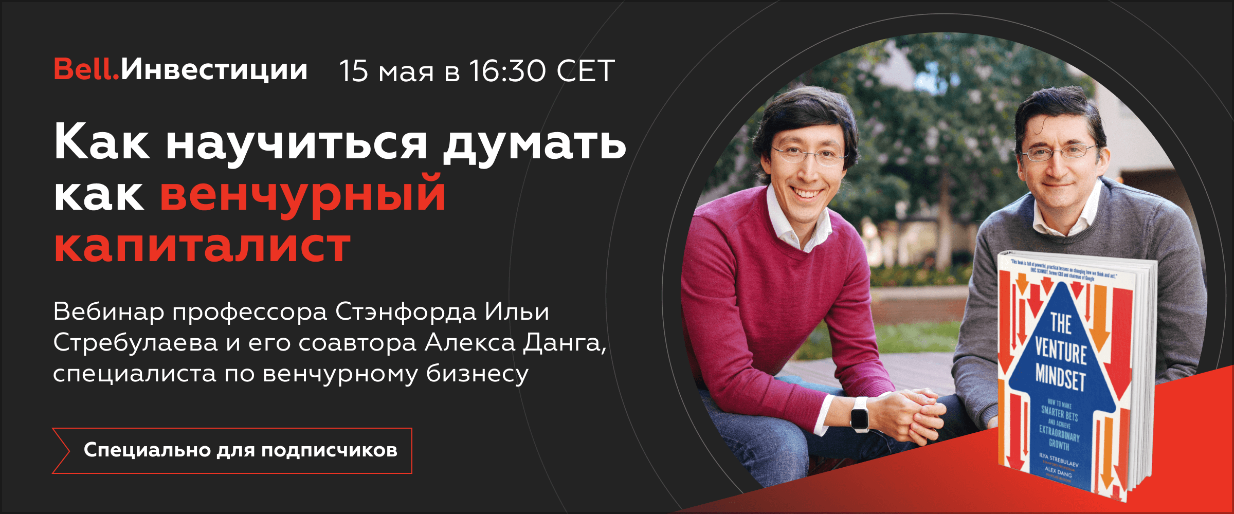 Редкое и очень радостное событие: профессор Стэнфорда Илья Стребулаев, интервью с которым мы в проекте «Это Осетинская» выпустили полтора месяца назад, совсем скоро проведет для подписчиков «Bell.Инвестиции» вебинар о том, как научиться думать как венчурный капиталист. Попасть на занятие Стребулаева — большая удача. Профессор коучит топ-менеджеров компаний, инвесторов и даже глав государств, а записаться на его курс в Стэнфорде тяжело даже студентам Стэнфорда. Вебинар пройдет 15 мая в 16:30 по центральноевропейскому времени (CET). Как на него попасть, рассказываем здесь. Не пропустите!