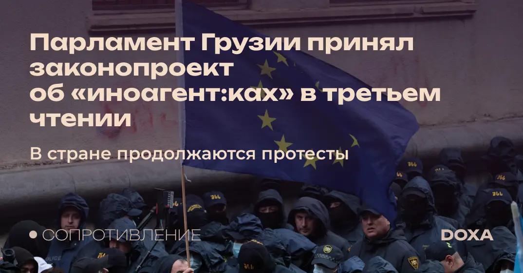 Парламент Грузии рассмотрел и принял в финальном третьем чтении законопроект об «иноагент:ках«О прозрачности иностранного влияния»». 84 депутат:ки из 116 проголосовали «за». В заседании объявляли технический перерыв из-за драки депутата продвигающей законопроект правящей партии «Грузинская мечта» Дито Самхарадзе и представитель:ниц оппозиции. Во время рассмотрения законопроекта 15 апреля в парламенте также подрались противник закона и депутат «Грузинской мечты».
