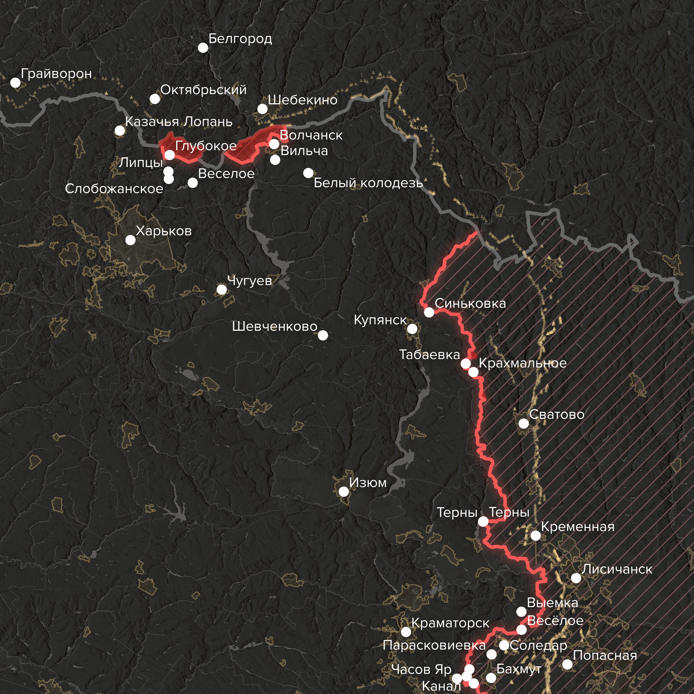 - Город в 50 километрах к северо-востоку от Харькова (и всего в пяти километрах от границы с Россией) был освобожден ВСУ в октябре 2022 года после полугода оккупации. С тех пор украинские войска не создали вокруг города мощной линии обороны — инженерным работам мешала близость границы с Россией и непрекращающиеся обстрелы.