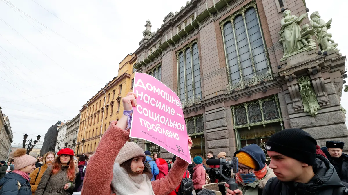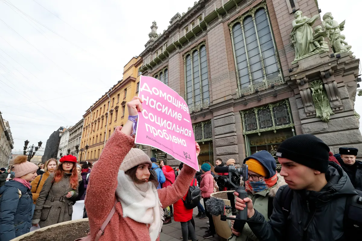A woman in St. Petersburg holds a banner reading: ”Domestic violence is a social problem“ on International Women’s Day, 8 March 2020. Photo: EPA-EFE/ANATOLY MALTSEV
