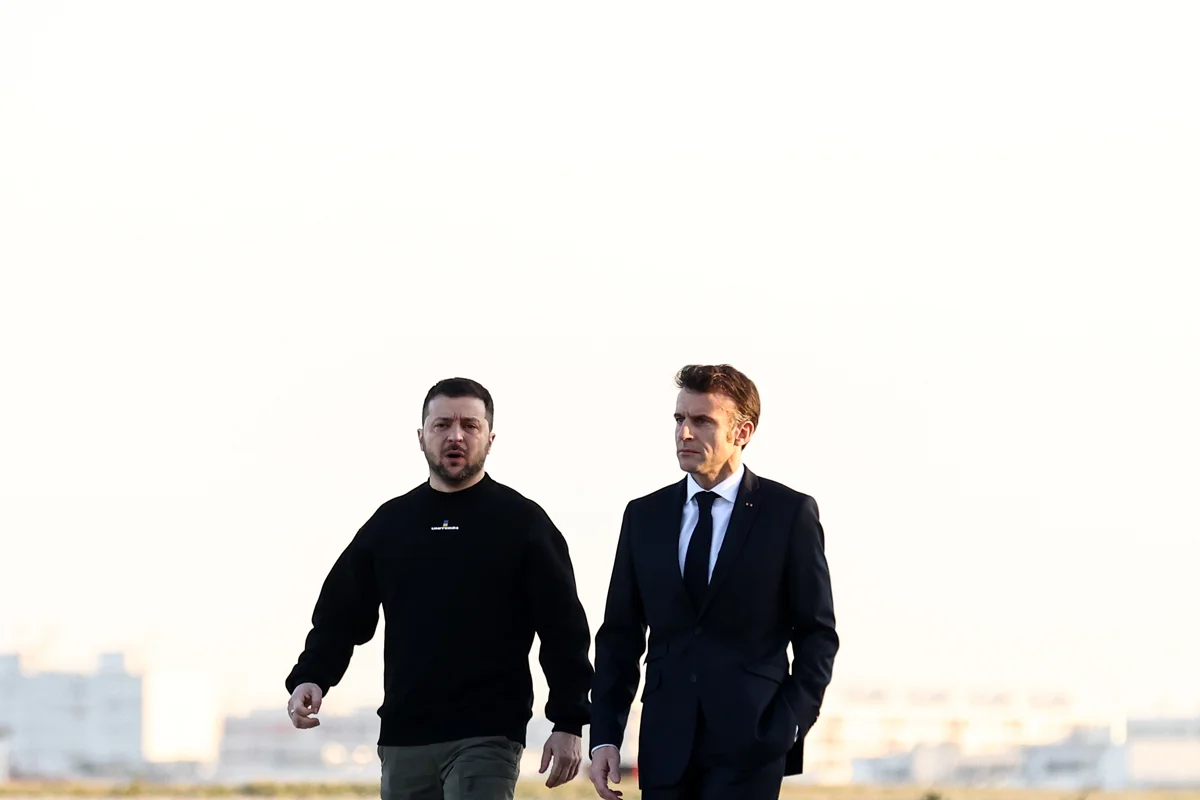Эмманюэль Макрон с президентом Украины Владимиром Зеленским в военном аэропорту Велизи-Виллакубле, Франция, 9 февраля 2023 года.Фото: Mohammed Badra / EPA-EFE