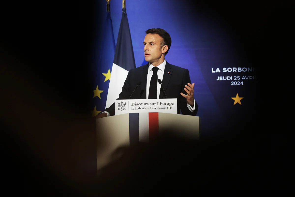 Эмманюэль Макрон выступает с речью в амфитеатре университета Сорбонна в Париже, 25 апреля 2024 года. Фото: Christophe Petit Tesson / EPA-EFE