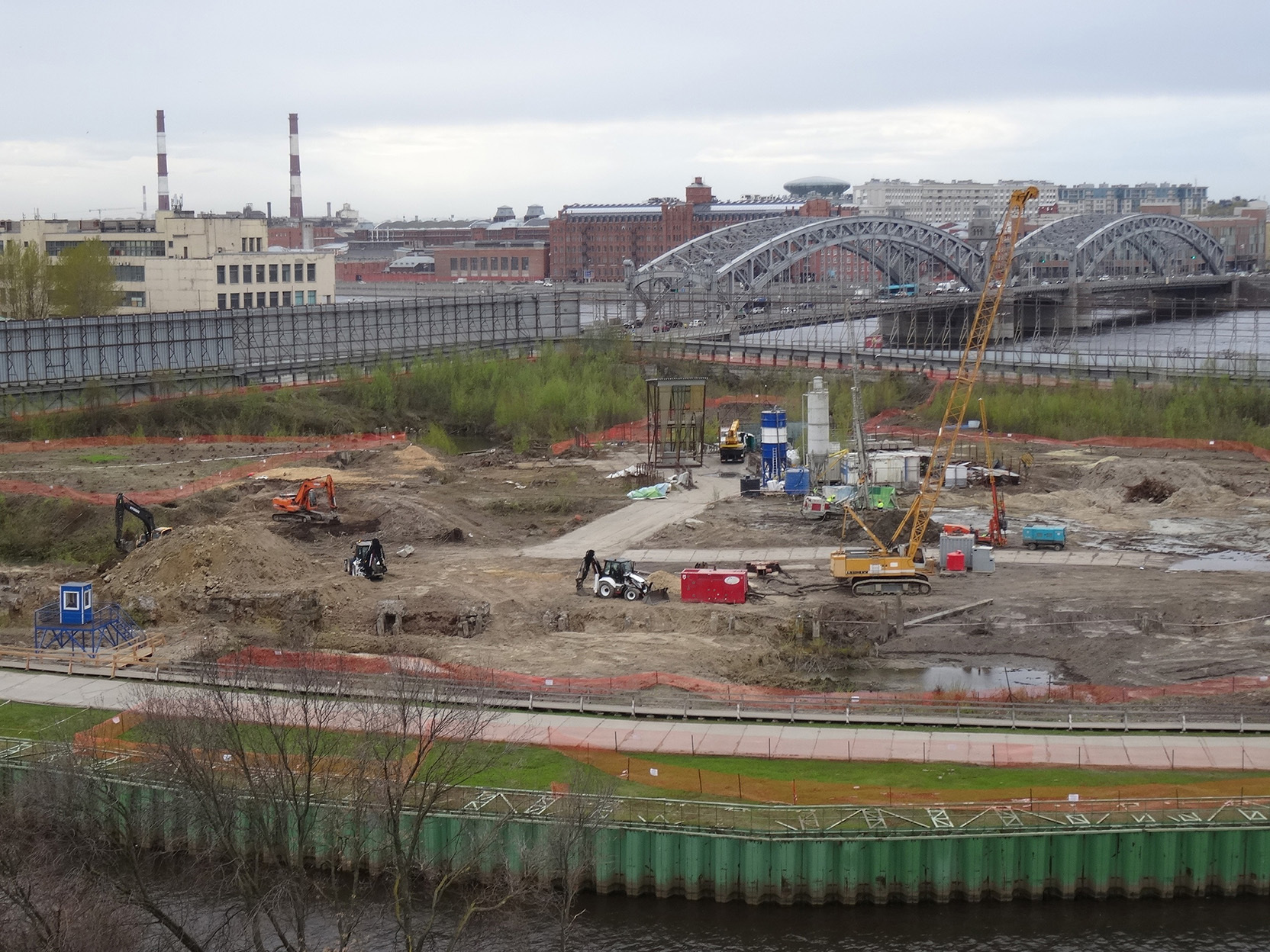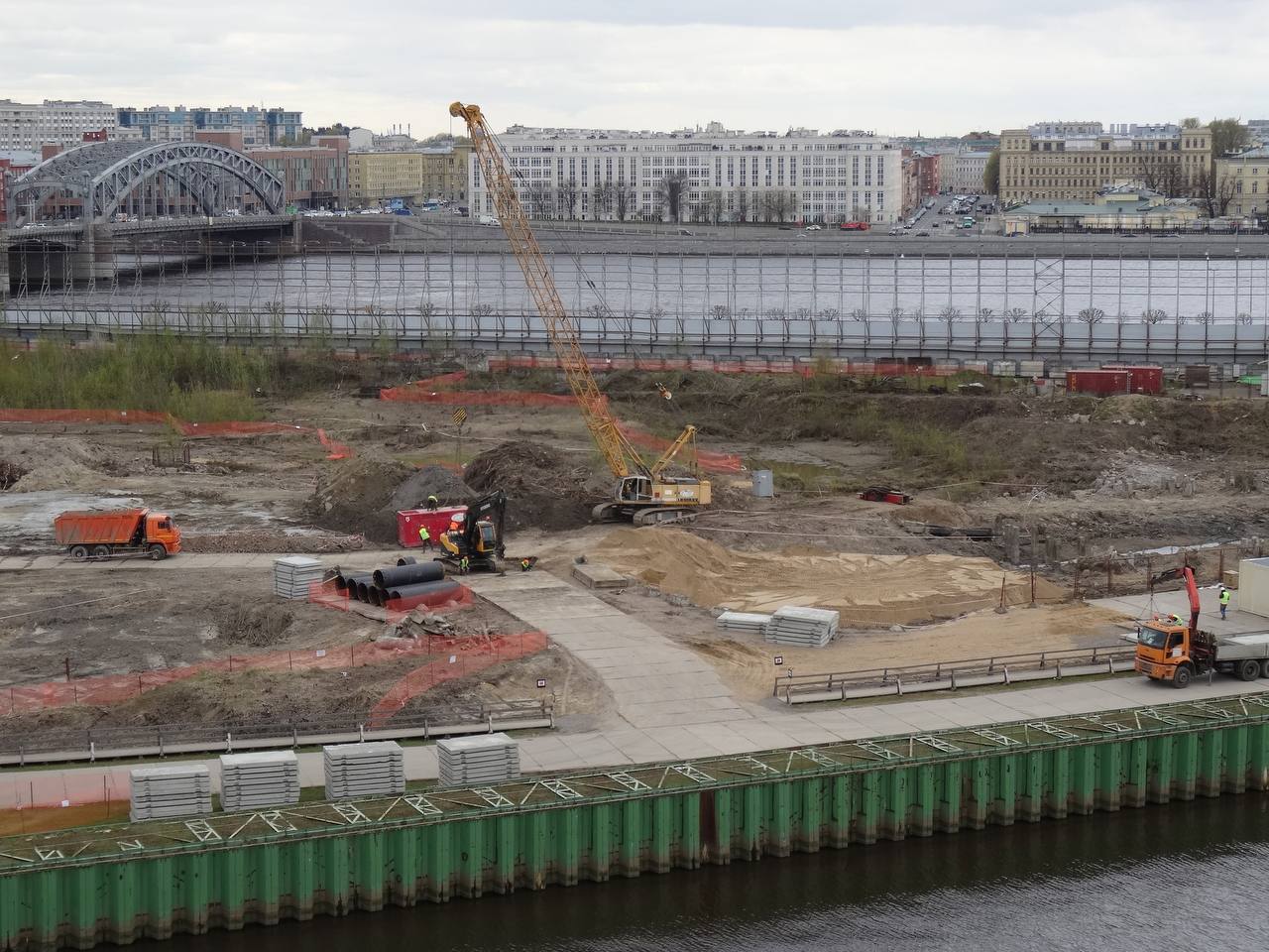 По данным жительницы Охты Анастасии, работы на мысе начались 5 апреля — они ведутся круглосуточно, без выходных. На месте стройки почти закончили откачивать воду и погружать шпунты. Также Анастасия рассказала, что на части мыса на метр убран слой земли, из-за чего обнажились деревянные конструкции — они могут принадлежать одной из крепостей.