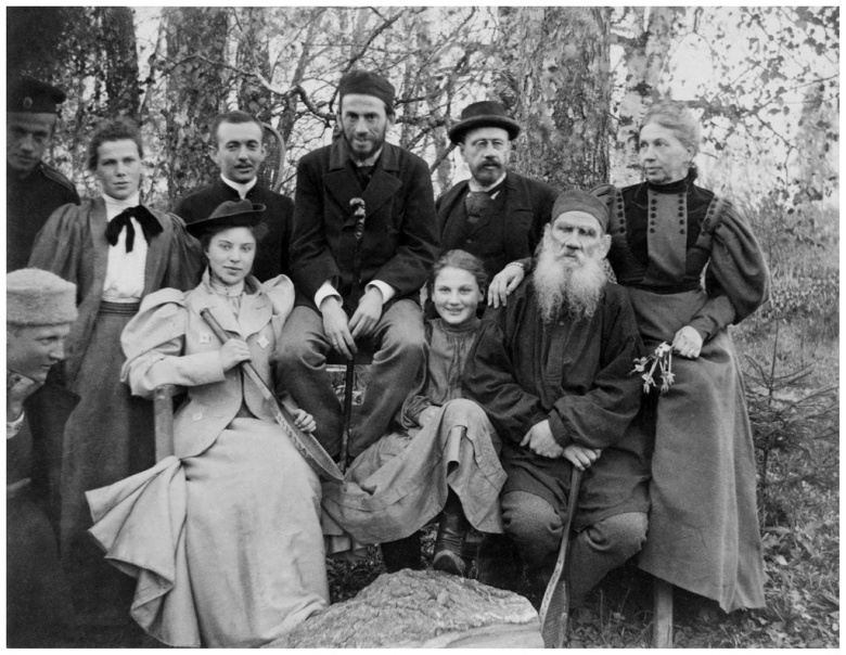 Лев и Софья Толстые с детьми и родственниками. Лев Львович сидит в центре во втором ряду, между женой и одной из сестер. Ясная Поляна, 1896
