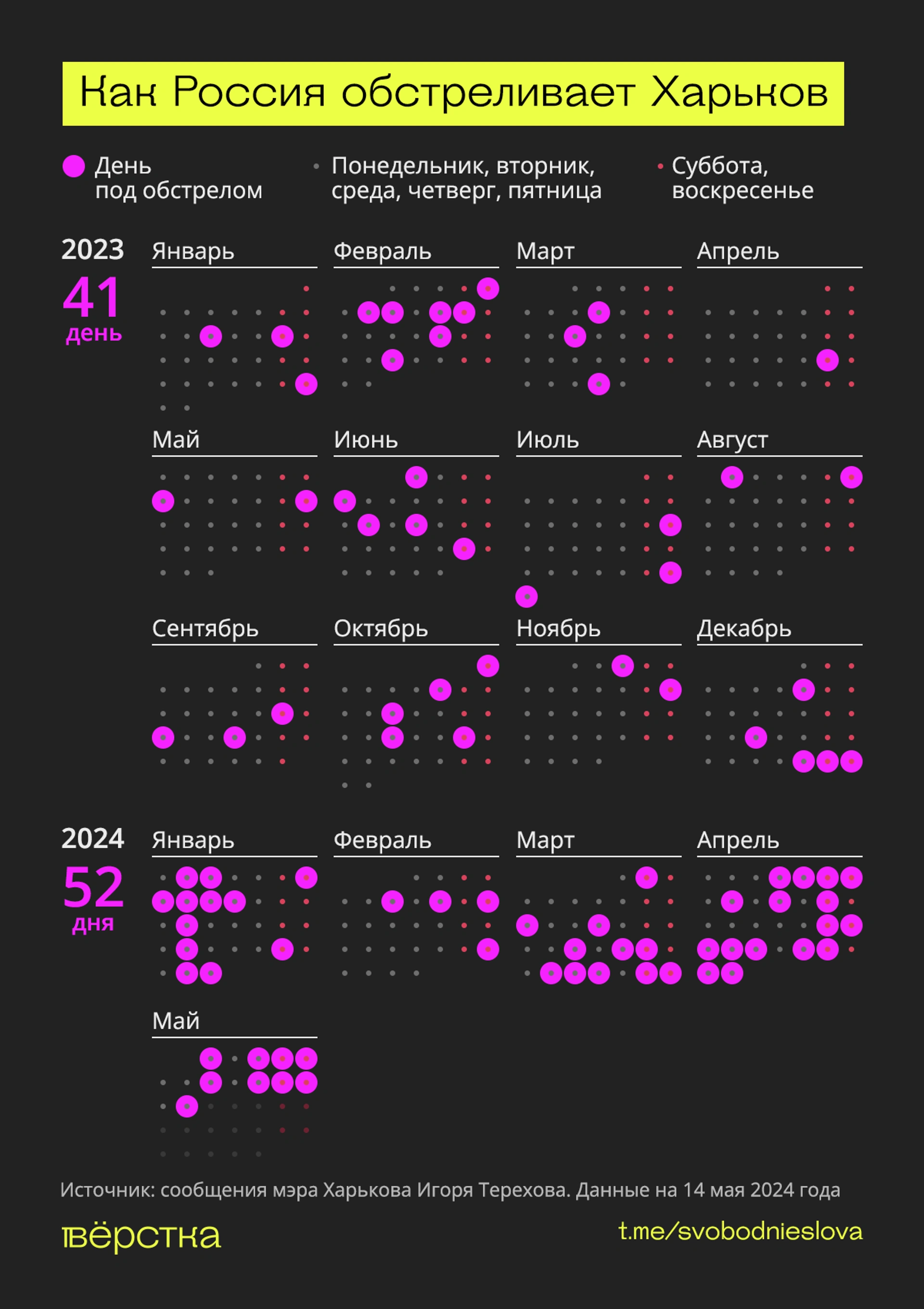 По подсчётам «Вёрстки», за неполные пять месяцев 2024 года Харьков подвергался обстрелам чаще, чем за весь 2023‑й. В прошлом году город был под обстрелами 41 день, а с января по май этого года — уже 53 дня. В апреле город обстреливали 15 дней, а в мае сообщения о «прилётах» поступали девять дней из 14. В результате российских атак в городе погибли и были ранены десятки человек.