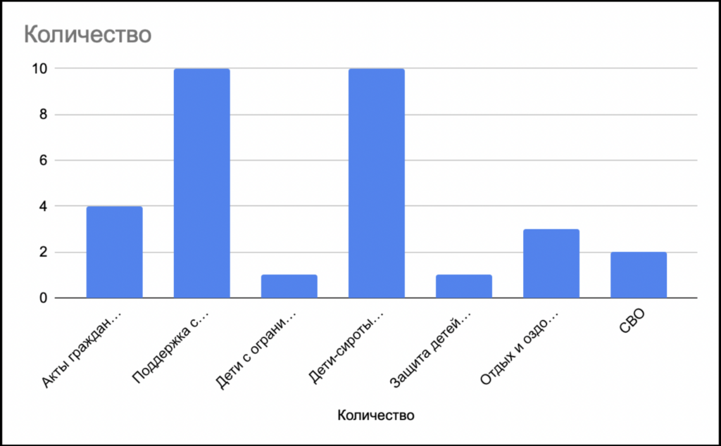 С марта 2022 по март 2024 года при участии комитета в Госдуме приняли 23 закона и рассматривали еще восемь. Подавляющее большинство из них нацелено на две группы: на детей, оставшихся без родителей и попечителей (10), и на семьи / одиноких родителей (еще 10).