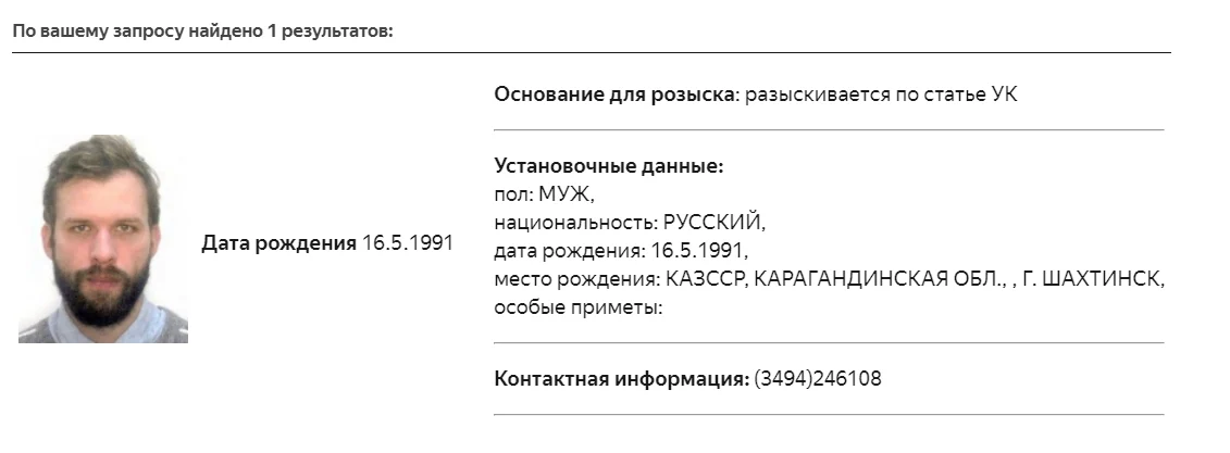 Как сказано в карточке, Бакалейко «разыскивается по статье УК». Другие подробности по делу в базе МВД не приводятся.