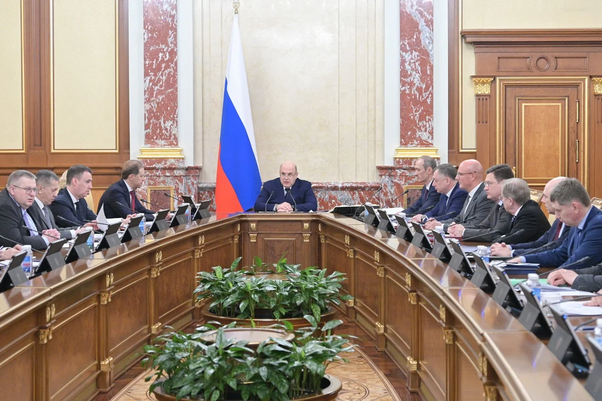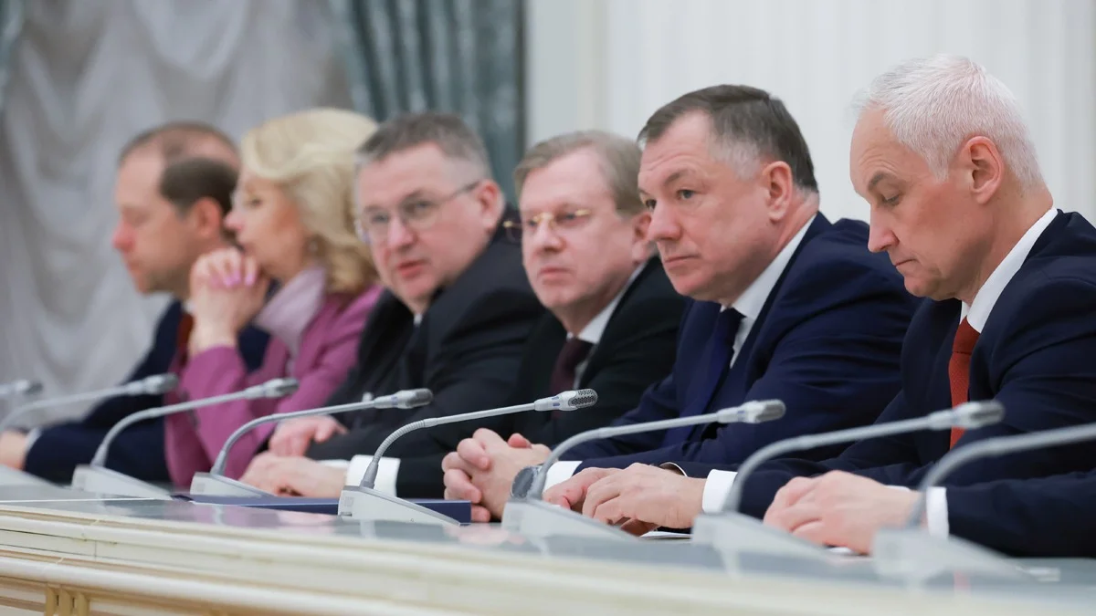 Справа налево: министр обороны Андрей Белоусов, вице-премьер Марат Хуснуллин, вице-премьер Виталий Савельев, заместитель председателя правительства Алексей Оверчук, вице-премьер Татьяна Голикова и первый вице-премьер РФ Денис Мантуров. Фото: Вячеслав Прокофьев / ТАСС