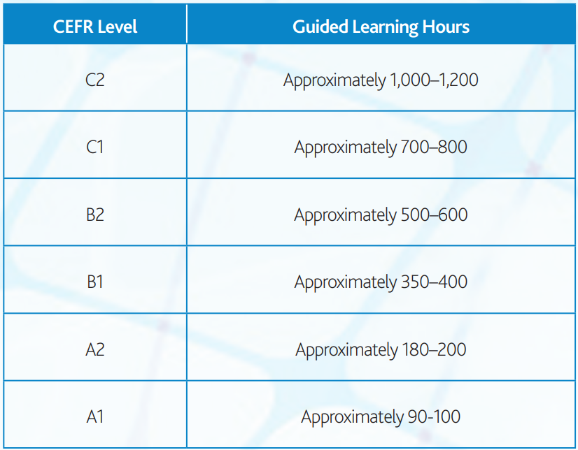- Помните, что процесс обучения всегда индивидуален. Согласно европейской системе изучения языков CEFR, определенного уровня можно достигнуть после конкретных часов обучения. Например, для B1 по английскому, потребуется от 350 до 400 часов учебы в классе или самостоятельно. Однако реальная скорость усвоения материала для каждого человека будет своя. Всё зависит от нагрузки по работе, языковой среды и других факторов.