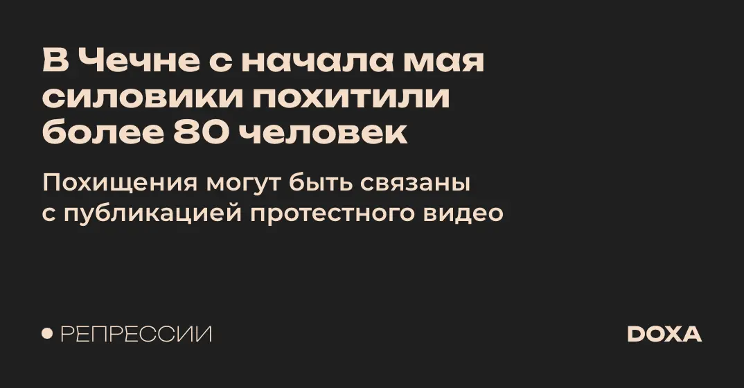 В Чечне с 6 по 14 мая силовики похитили от 80 до 90 человек, сообщает правозащитный проект «Мемориал». Первыми о волне похищений сообщили чеченские оппозиционные телеграм-каналы, среди них — 1ADAT. Они связывают массовые похищения с распространившемся 6 мая видео поджога автомобиля с надписью на номерах: «Дустум». Это бывший позывной Рамзана Кадырова, а также прозвище его сына Адама.