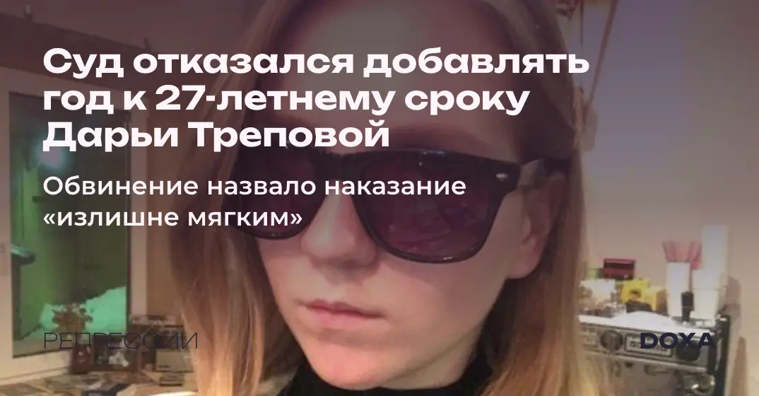 Апелляционный военный суд отказался ужесточать приговор Дарье Треповой на один год по требованию прокуратуры, сообщила «Медиазона». Обвинение посчитало срок в 27 лет недостаточным и требовало увеличить его до 28 лет, назвав наказание «излишне мягким».