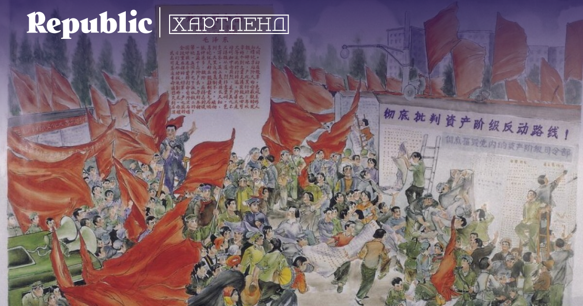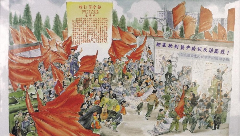 "Огонь по штабам!". Картина времен "культурной революции", на которой в центре - щит-дацзыбао с призывом Мао Цзэдуна "открыть огонь по штабам", справа - стена с "народными дацзыбао" под общей шапкой "До конца раскритиковать реакционную линию капиталистического класса!"