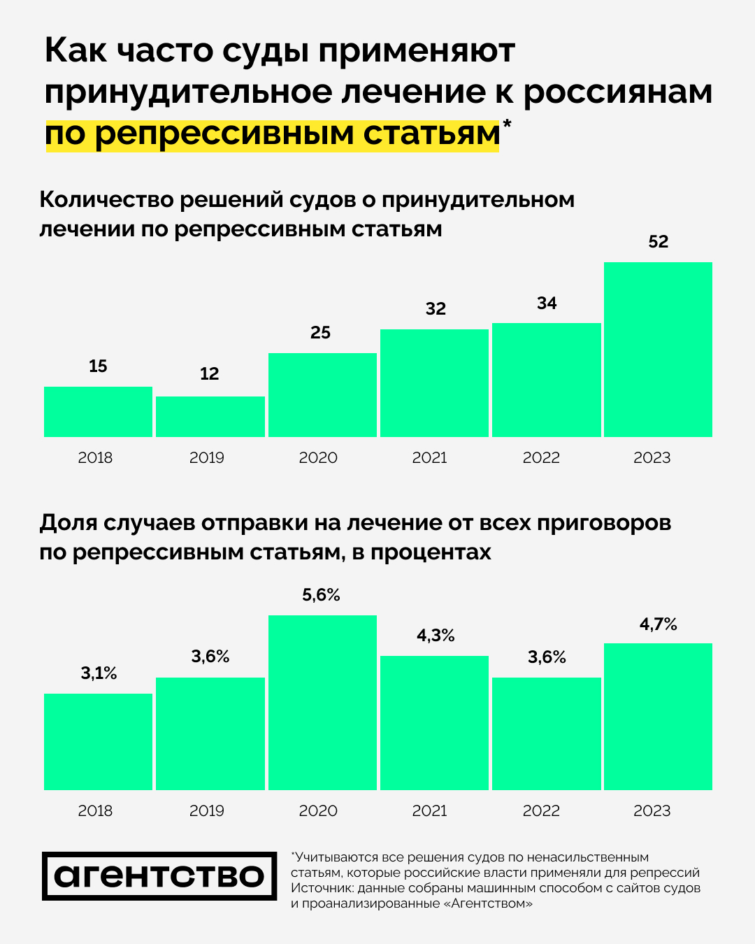 - Больше половины из 170 решений были вынесены после полномасштабного вторжения в Украину в феврале 2022 года. Если за четыре довоенных года на лечение было отправлено 84 человека (2018 год — 15, 2019 — 12, 2020 — 25, 2021 — 32), то после начала войны – 86 человек (2022 год – 34 случаев, 2023 – 52). Доля таких решений от всех приговоров по репрессивным статьям колебалась от 3,1% в 2018-м до 3,6% в 2022-м и 4,7% – в 2023-м.