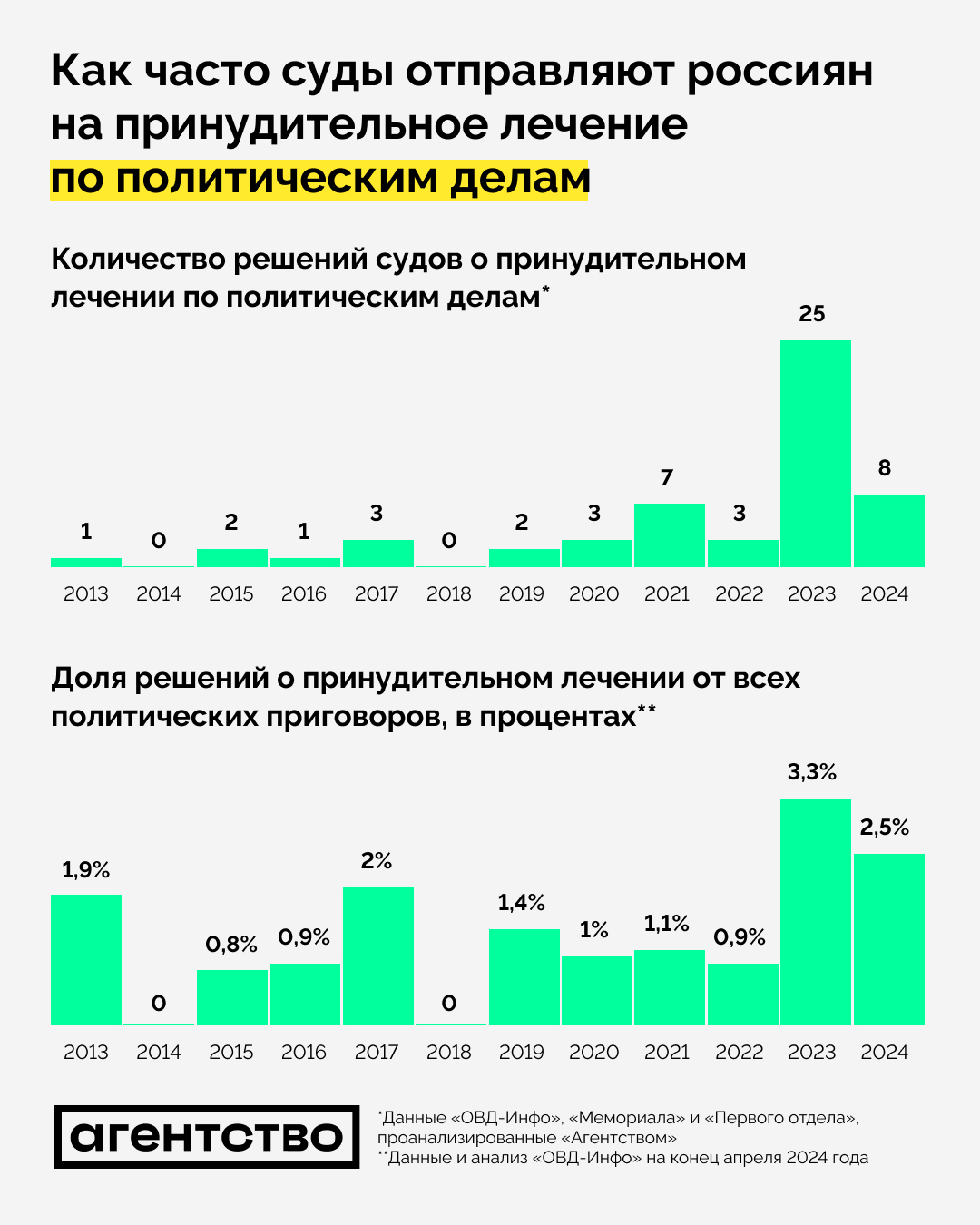 Детали. «Агентство» проанализировало данные «ОВД-Инфо», «Мемориала» и «Первого отдела» о россиянах, отправленных российскими судами на принудительное лечение по политически мотивированным делам. Мы сложили их данные, отсеяв повторяющиеся дела. Получилось, что с 2013 года стало известно о как минимум 55 случаях принудительного лечения.