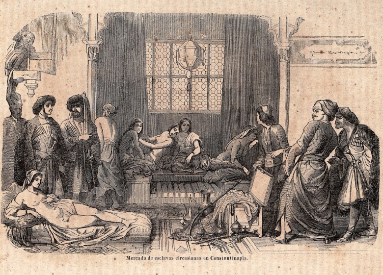 Черкесские пленницы на невольничьем рынке в Константинополе. Гравюра 1851 г.