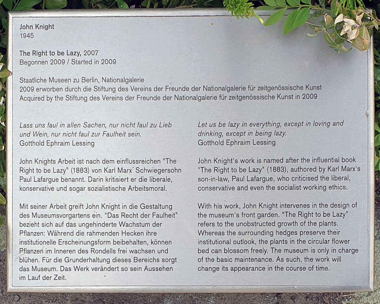 «Право лениться» представляет собой, по сути, инструкцию для садовника. Это самая простая инструкция на свете: ее единственное требование — не трогать газон перед музеем. Точнее, за низенькой живой изгородью ухаживать можно, а вот окруженный ею круглый пятачок земли должен оставаться неприкосновенным. Посетители, не знающие о проекте Найта, регулярно жалуются на «запустение», но команда Hamburger Bahnhof стоит на своем: уже 15 лет растения в музейном дворе не делят на «сорные» и «культурные». Так газон — символ укрощения природы — стал, наоборот, витриной ее эмансипации. Ровно такой же сюжет развивается в картине Виктора Косаковского «Архитектон», где ее главный герой — архитектор Микеле Де Лукки — обозначает на своем участке место, куда нельзя заходить людям.