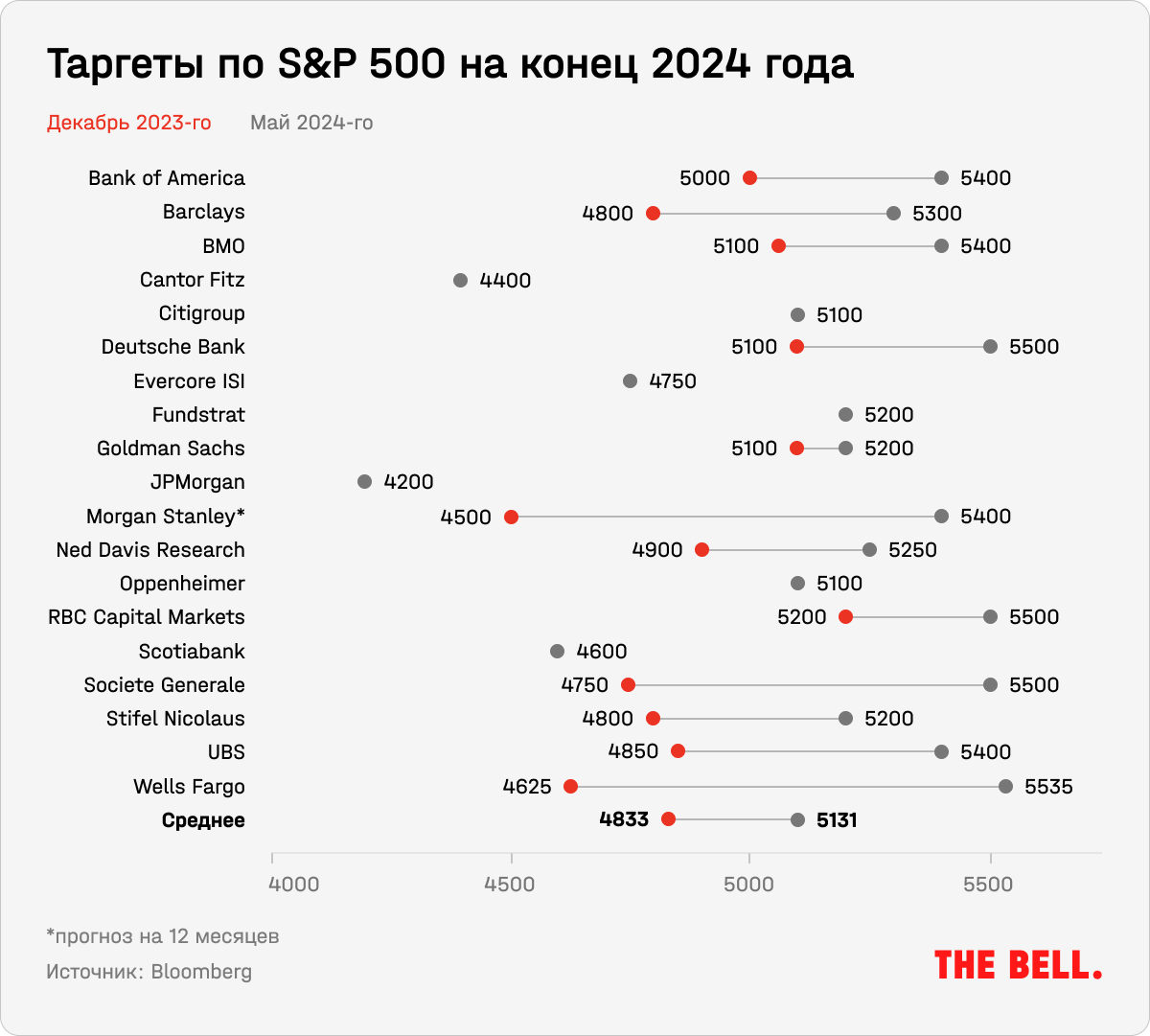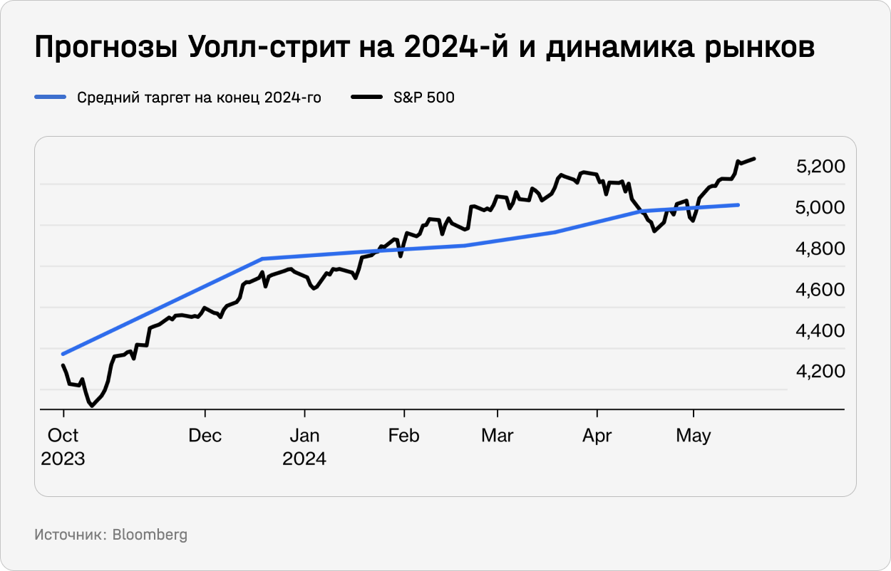 Оптимизм по поводу американского рынка нарастает. По данным Marketwatch, с начала 2024-го свои таргеты по S&P 500 повысили 11 крупнейших инвестбанков. Только на прошлой неделе BMO Capital Markets и Deutsche Bank увеличили их до 5600 и 5500 пунктов соответственно. Всего, по данным Bloomberg, к маю ⅔ стратегов повысили свои прогнозы по сравнению с декабрьскими оценками.