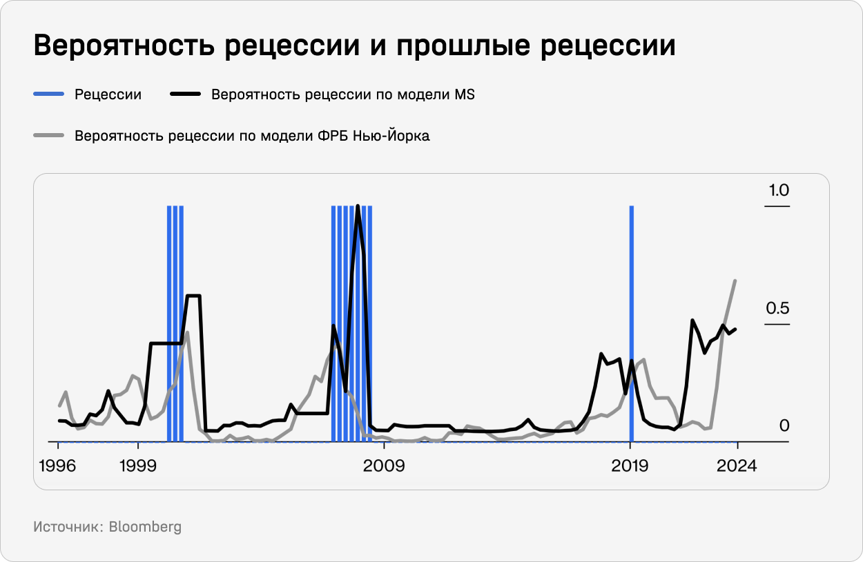 Два индикатора вероятности рецессии — от Morgan Stanley, который основан на данных о ситуации на финансовых рынках, и от ФРБ Нью-Йорка, основанный на кривой доходности казначейских обязательств, — указывают на то, что «жесткая посадка» экономики, в которую рынки уже давно не верят, выглядит как вполне реальный риск. В прошлом эти индикаторы достаточно точно предсказывали рецессию. Сейчас экономические условия сложнее предсказывать, так как макроэкономические данные остаются волатильными, отмечает Уилсон.