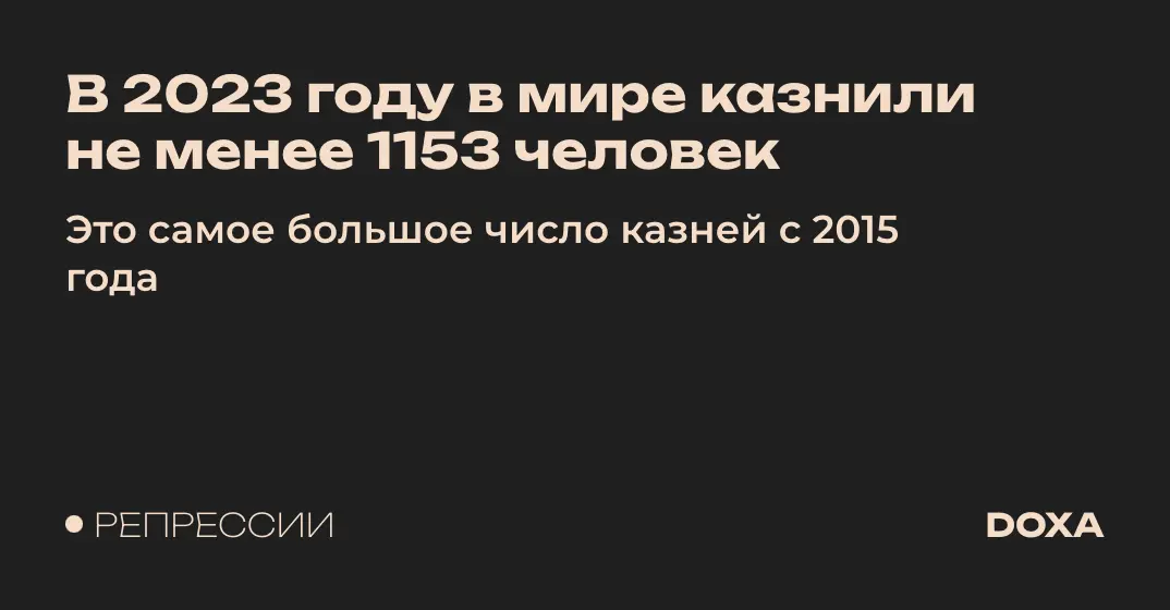 В мире казнили рекордное число людей с 2015 года — минимум 1153 за 2023 год, подсчитала правозащитная организация Amnesty International. Количество смертных приговоров за год достигло 2428. При этом общее число стран, которые проводили казни, в 2023 году составило 16, что стало самым низким за историю С 1979 годанаблюдения организации.
