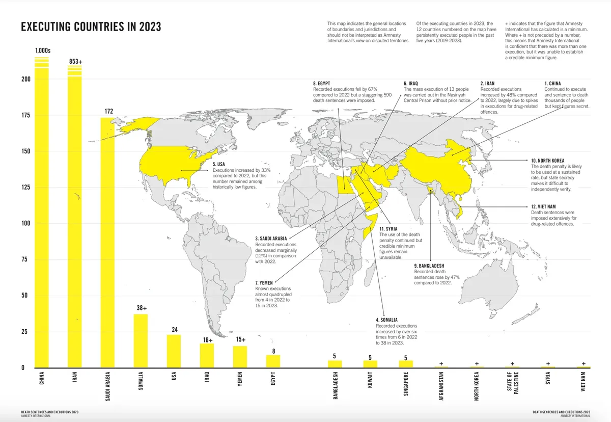 Большинство смертных приговоров было исполнено в 2023 году в Иране (853 казни) и Саудовской Аравии (172 казни). Также увеличилось количество смертных приговоров в Сомали (38 казней) и США (24 казни).