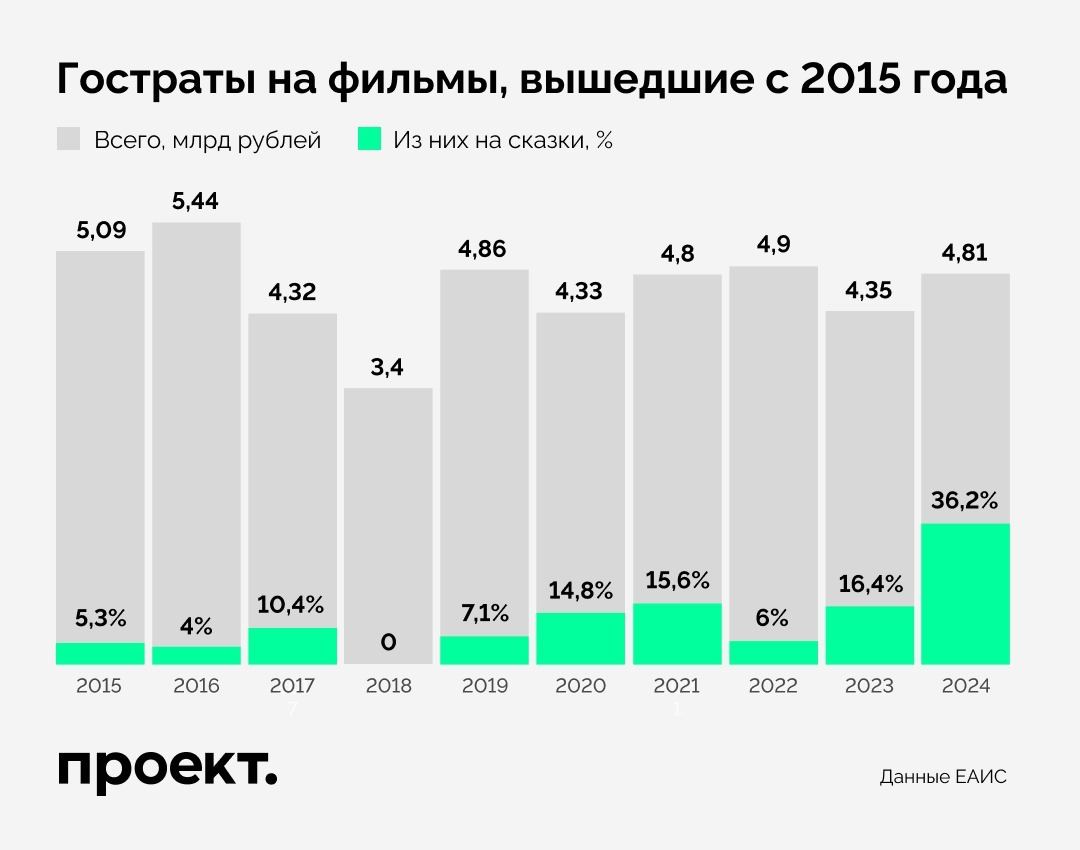 Росла и доля фильмов-сказок в общих тратах государства на кинематограф — с 5,3% в 2015 году до 36,2% в 2024-м (учитывались только фильмы, вышедшие в прокат).