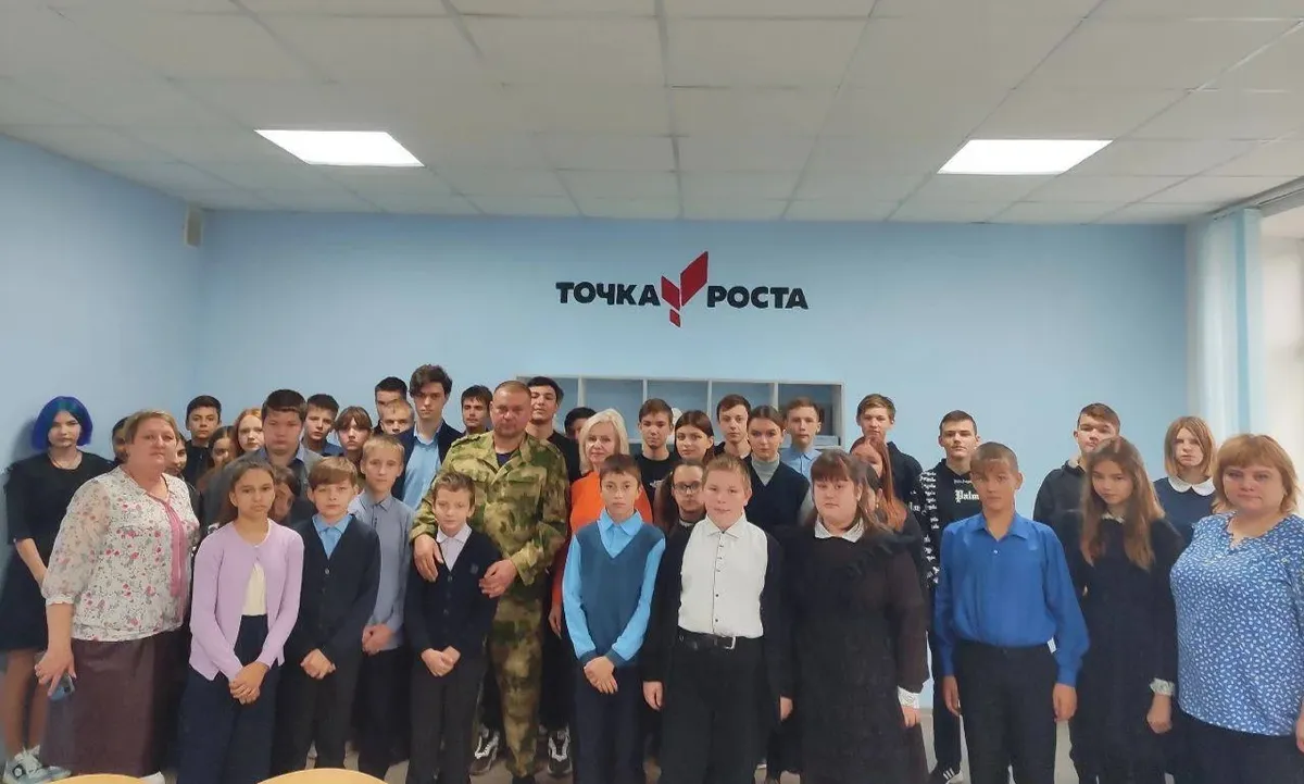 На снимках Кирюхин жмет руки шестиклассникам. Обнимает учительницу в скромном платье в горошек. Позирует на фоне плаката с собственной фотографией и подписью «Герой среди нас».