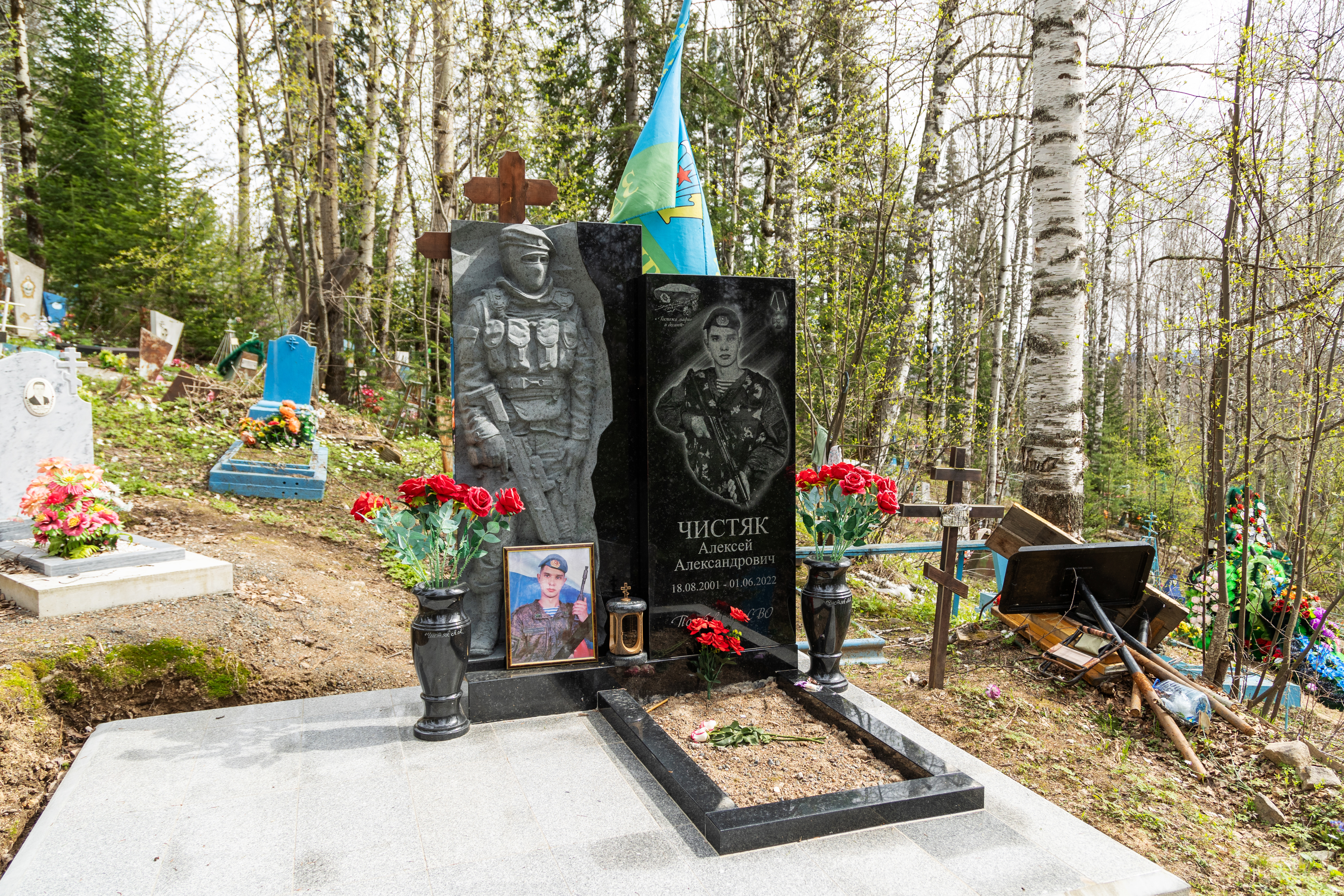 Но на местном кладбище, подальше от входа – могила 20-летнего десантника Алексея Чистяка, погибшего в июне 2022 года. В социальных сетях его отца фотографии 2011 года: Леше 10 лет, он обнимает отца и сестру.