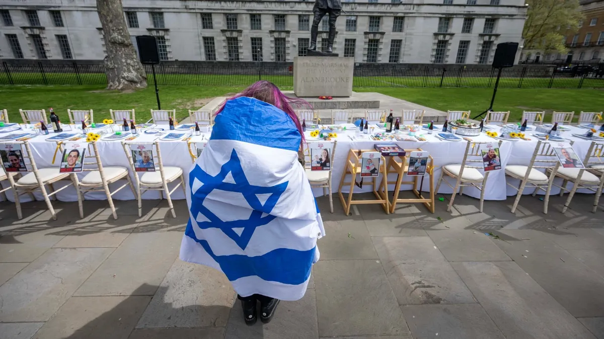 Акция «Пустой стол для седера» со 133 стульями, символизирующими удерживаемых ХАМАС заложников, в Лондоне. Фото: Zuma TASS