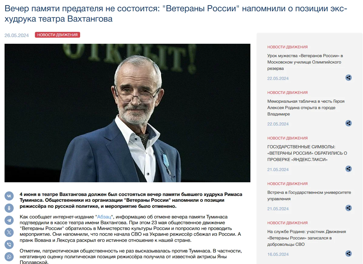 Театр имени Вахтангова отменил вечер памяти Римаса Туминаса после доноса «Ветеранов России». Те призвали Минкульт не только отменить вечер, но и убрать из репертуара все 13 постановок Туминаса. Видимо, «чтоб два раза не вставать», ведь организация и без того пишет так много доносов, что еле справляется. «Ветераны» потребовали — театр послушался. Это все чаще случается — еще недавно никому не известные фрики, используя донос как социальный лифт, раздуваются до невероятных размеров. Правда, прежде «Ветераны» воевали с живыми.