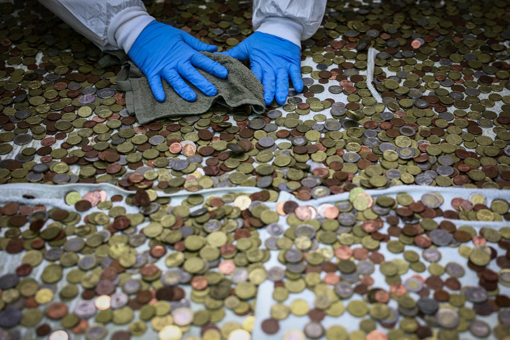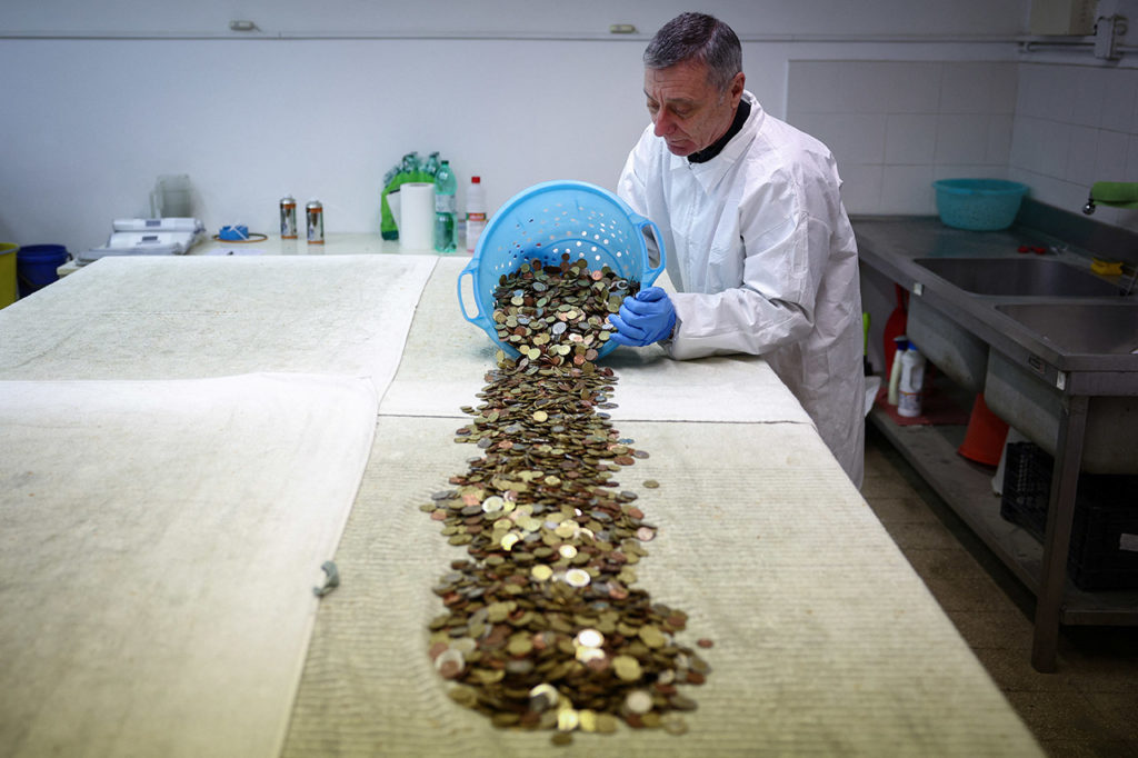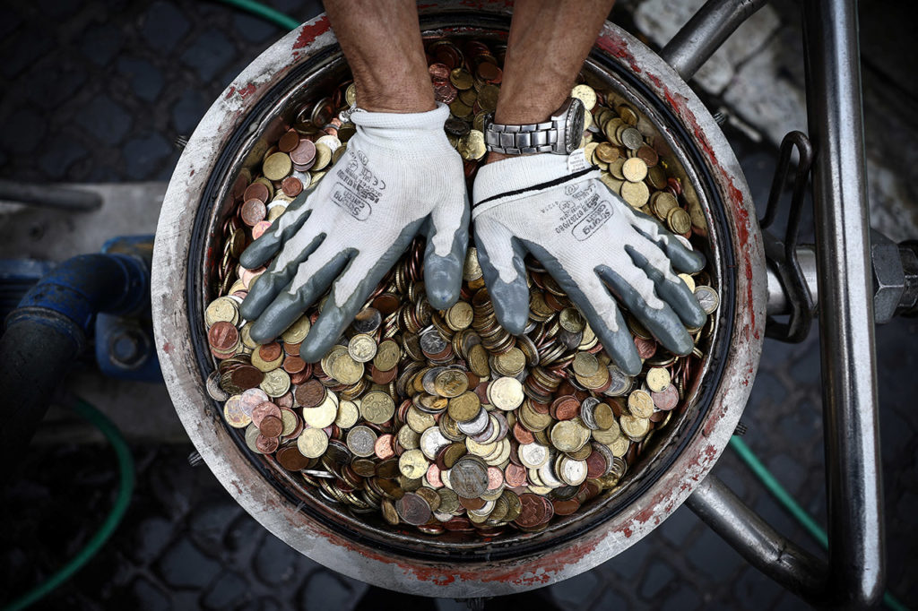 Собранные монеты передают католической благотворительной организации Caritas, чьи волонтеры раскладывают ведра с монетами на большие столы, сушат каждую монетку феном, сортируют их и подсчитывают. Сотрудник Caritas Фабрицио Маркиони рассказывает, что помимо монет из фонтана также достают драгоценности, зубные протезы, религиозные медали и даже кусочки пуповин.